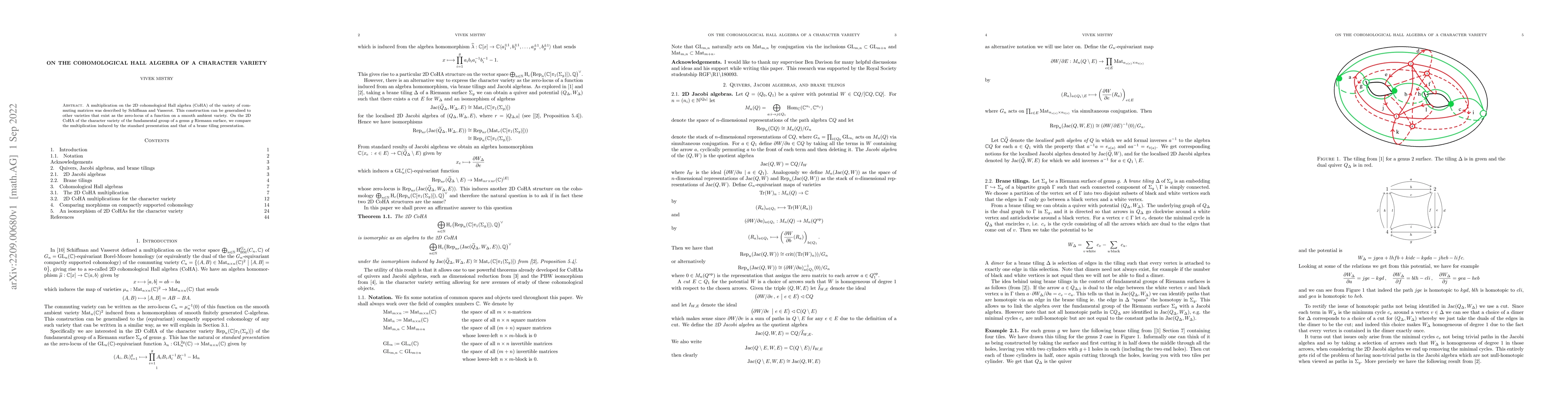 This paper generalizes the cohomological Hall algebra multiplication from commuting matrices to character varieties, comparing the standard and brane tiling presentations of the 2D CoHA for a genus $g$ Riemann surface.