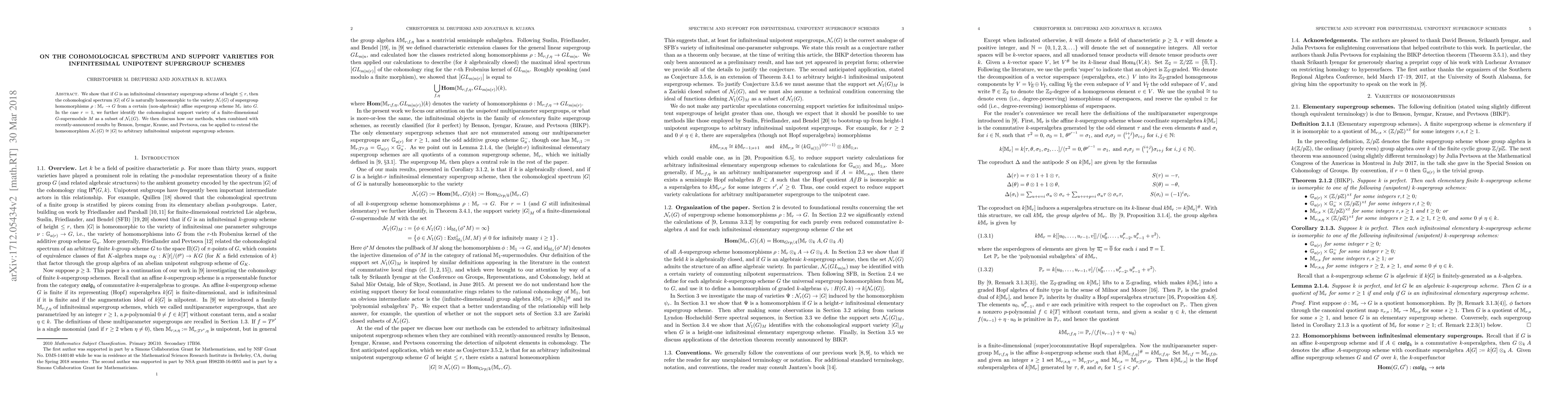 This paper demonstrates a homeomorphism between the cohomological spectrum of an infinitesimal elementary supergroup scheme and a certain variety of homomorphisms from an affine supergroup scheme. For $r=1$, it identifies the cohomological support variety of a $G$-supermodule as a subset of this variety, and extends the result to all infinitesimal unipotent supergroup schemes using recent advancements.