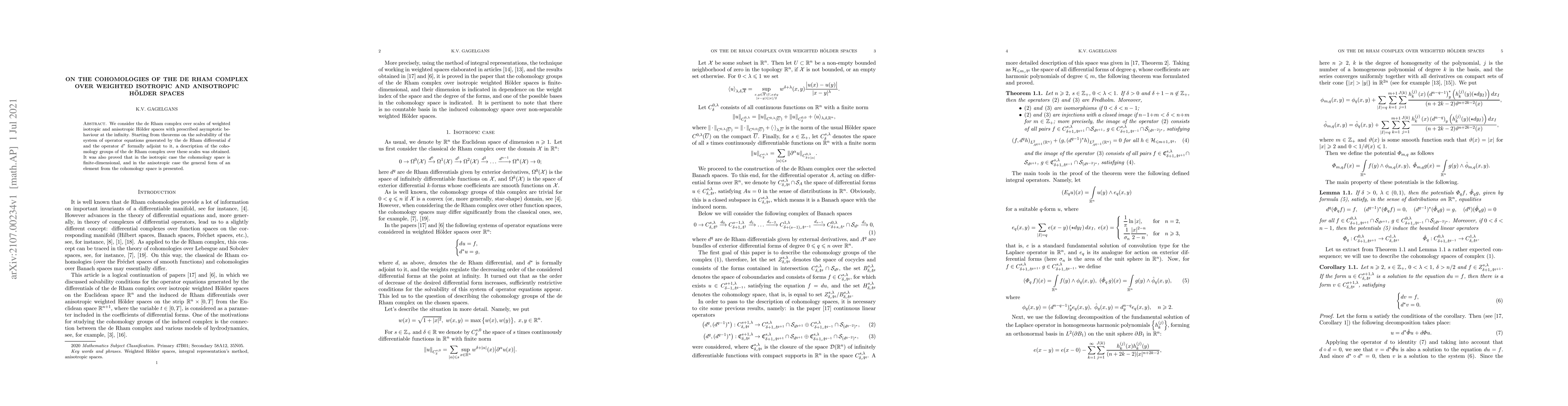We consider the de Rham complex over scales of weighted isotropic and anisotropic H\"older spaces with prescribed asymptotic behaviour at the infinity. Starting from theorems on the solvability of the system of operator equations generated by the de Rham differential $d$ and the operator $d^*$ formally adjoint to it, a description of the cohomology groups of the de Rham complex over these scales was obtained. It was also proved that in the isotropic case the cohomology space is finite-dimensional, and in the anisotropic case the general form of an element from the cohomology space is presented.