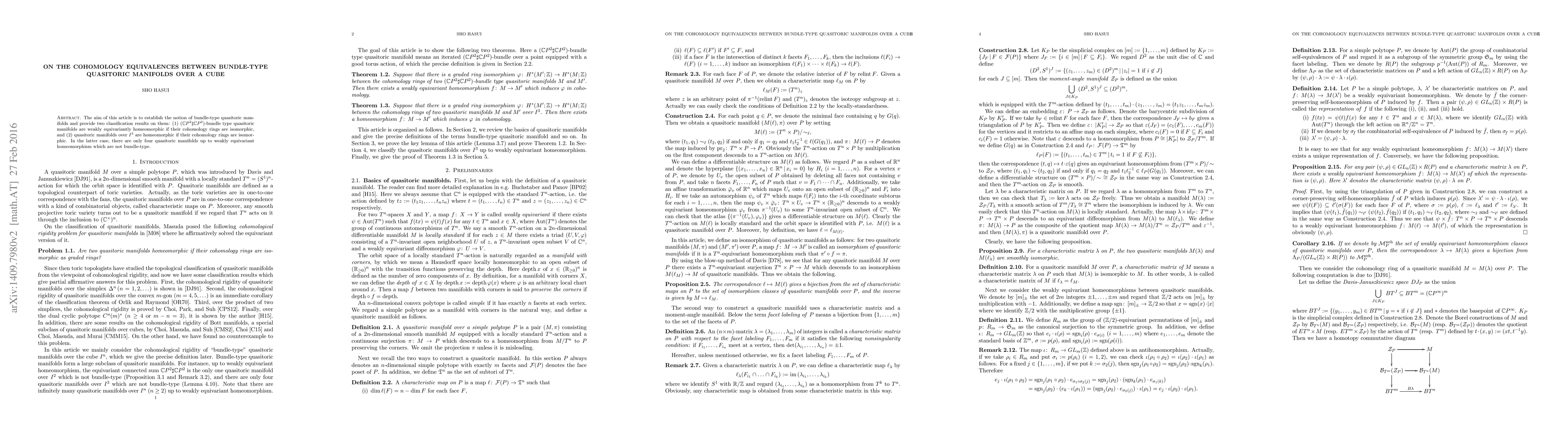 This paper introduces bundle-type quasitoric manifolds and establishes two classifications: (1) $(\mathbb{C}P^2\sharp\mathbb{C}P^2)$-bundle quasitoric manifolds are weakly equivariantly homeomorphic if their cohomology rings are isomorphic. (2) Quasitoric manifolds over $I^3$ are homeomorphic if their cohomology rings are isomorphic, with only four exceptions.