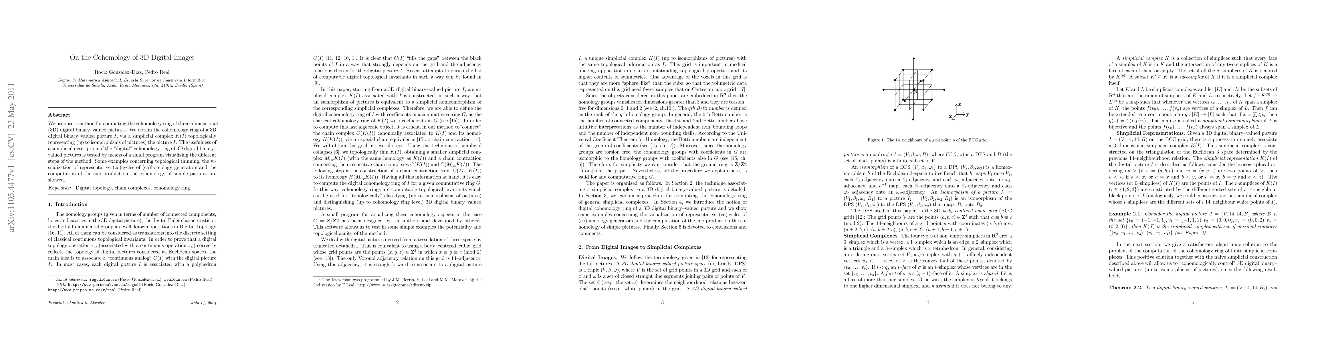 We propose a method for computing the cohomology ring of three--dimensional (3D) digital binary-valued pictures. We obtain the cohomology ring of a 3D digital binary--valued picture $I$, via a simplicial complex K(I)topologically representing (up to isomorphisms of pictures) the picture I. The usefulness of a simplicial description of the "digital" cohomology ring of 3D digital binary-valued pictures is tested by means of a small program visualizing the different steps of the method. Some examples concerning topological thinning, the visualization of representative (co)cycles of (co)homology generators and the computation of the cup product on the cohomology of simple pictures are showed.