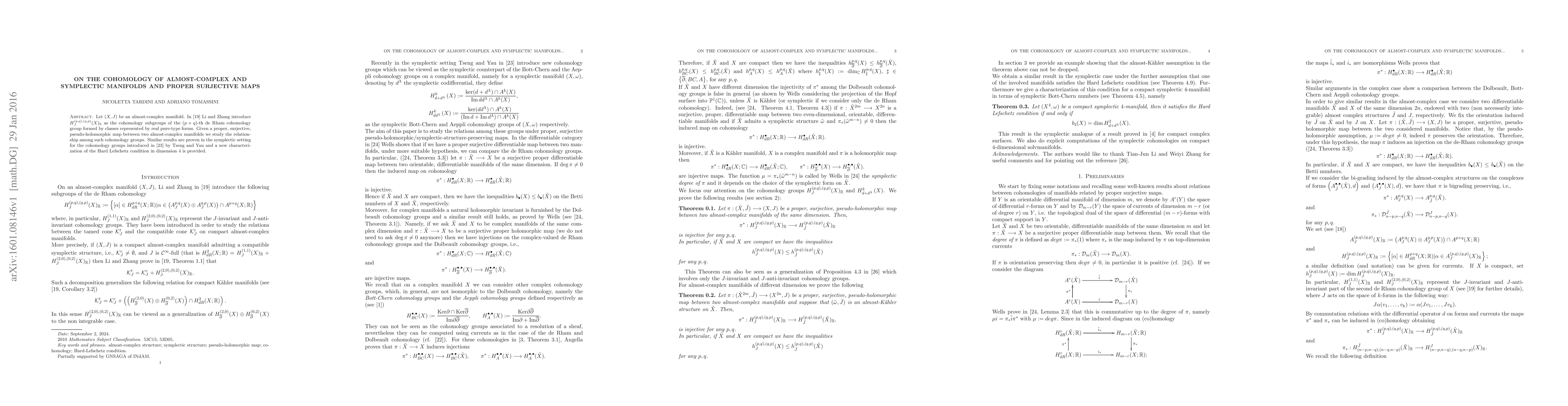 Let $(X,J)$ be an almost-complex manifold. In \cite{li-zhang} Li and Zhang introduce $H^{(p,q),(q,p)}_J(X)_{\rr}$ as the cohomology subgroups of the $(p+q)$-th de Rham cohomology group formed by classes represented by real pure-type forms. Given a proper, surjective, pseudo-holomorphic map between two almost-complex manifolds we study the relationship among such cohomology groups. Similar results are proven in the symplectic setting for the cohomology groups introduced in \cite{tsengyauI} by Tseng and Yau and a new characterization of the Hard Lefschetz condition in dimension $4$ is provided.