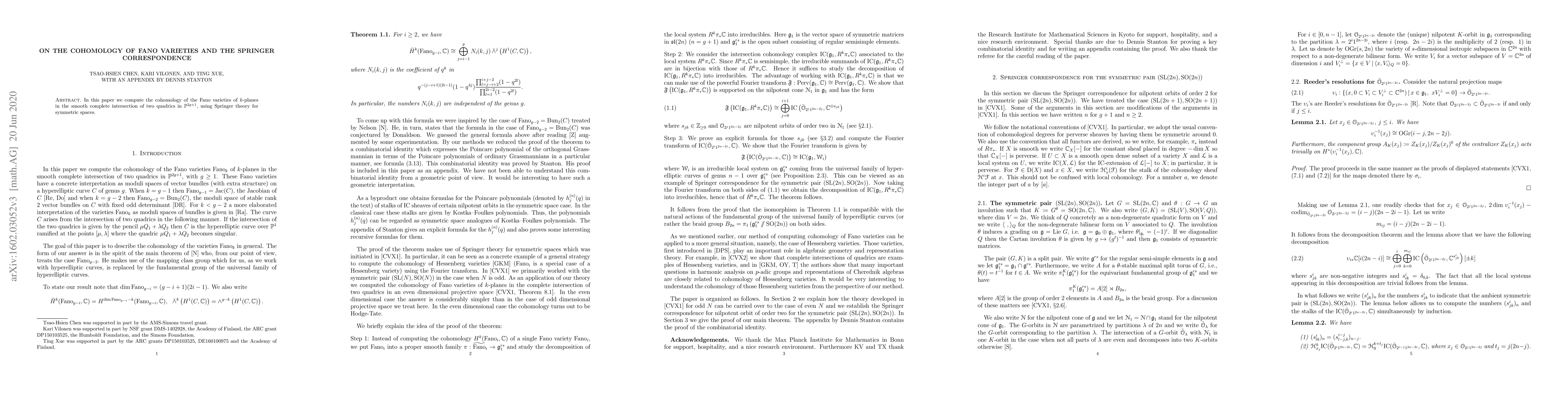 This paper computes the cohomology of Fano varieties of $k$-planes in a smooth complete intersection of two quadrics in $\mathbb{P}^{2g+1}$ by leveraging Springer theory for symmetric spaces. The results provide insights into the structure of these varieties.