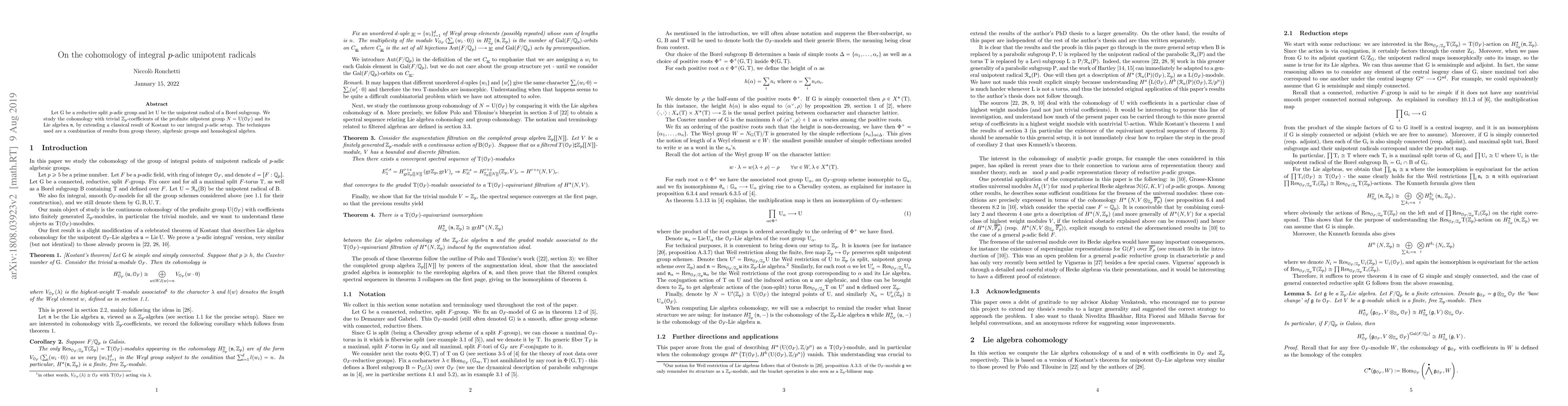 Let $\mathrm G / F$ be a reductive split $p$-adic group and let $\mathrm U$ be the unipotent radical of a Borel subgroup. We study the cohomology with trivial $\mathbb Z_p$-coefficients of the profinite nilpotent group $N = \mathrm U(\mathcal O_F)$ and its Lie algebra $\mathfrak n$, by extending a classical result of Kostant to our integral $p$-adic setup. The techniques used are a combination of results from group theory, algebraic groups and homological algebra.