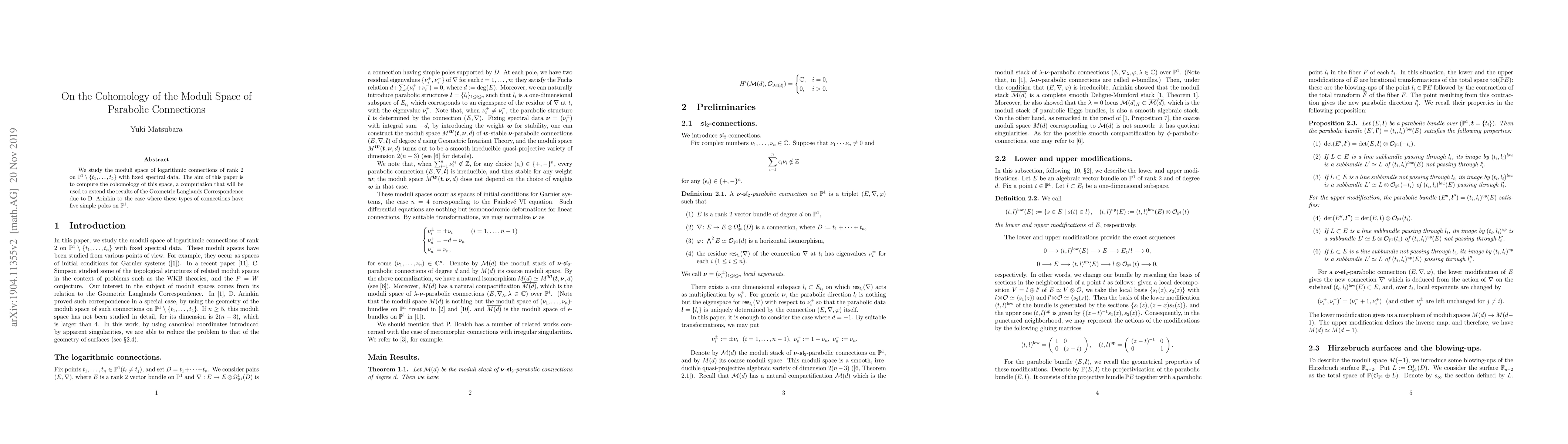 We study the moduli space of logarithmic connections of rank $2$ on $\mathbb{P}^1 \setminus \{ t_1, \dots, t_5 \}$ with fixed spectral data. The aim of this paper is to compute the cohomology of such space, and this computation will be used to extend the results of Geometric Langlands Correspondence due to D. Arinkin to the case where this type of connections have five simple poles on $\mathbb{P}^1$.