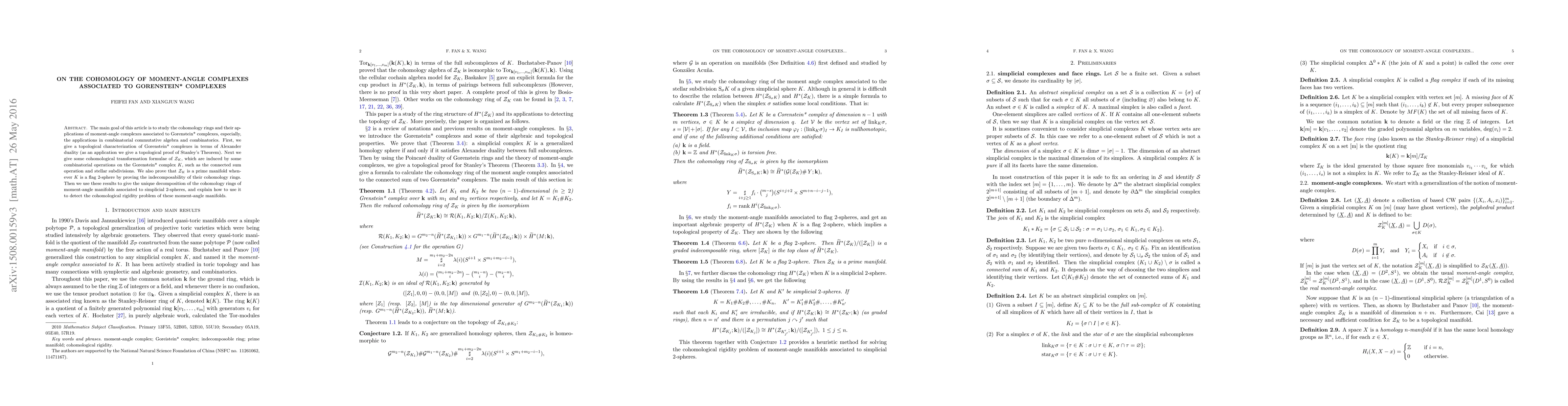 This paper explores the cohomology rings of moment-angle complexes linked to Gorenstein* complexes, applying these findings to combinatorial commutative algebra and combinatorics. It also proves the indecomposability of cohomology rings for flag 2-spheres, aiding in the unique decomposition of moment-angle manifolds' cohomology.