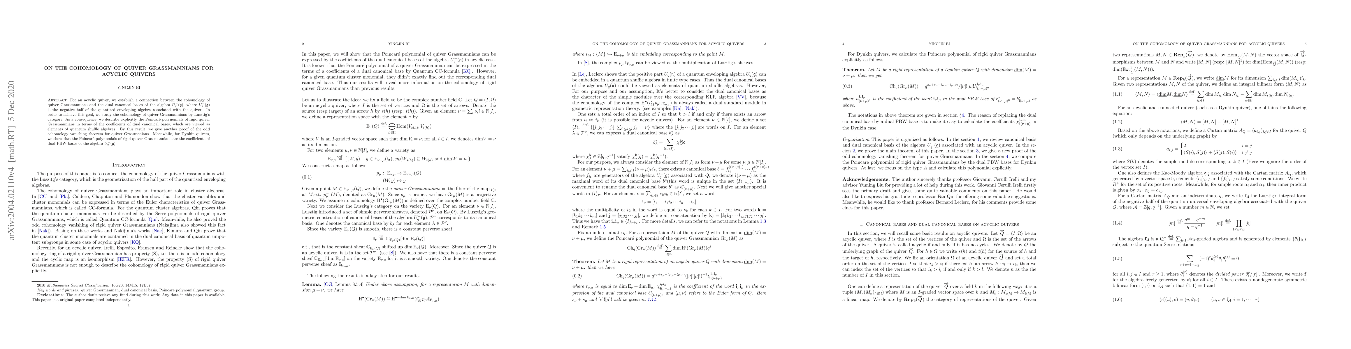 This paper connects the cohomology of acyclic quiver Grassmannians to the dual canonical bases of the quantized enveloping algebra $U_q^-(\mathfrak{g})$. It explicitly describes the Poincaré polynomials of rigid quiver Grassmannians using quantum shuffle algebras and provides an alternative proof of the odd cohomology vanishing theorem.