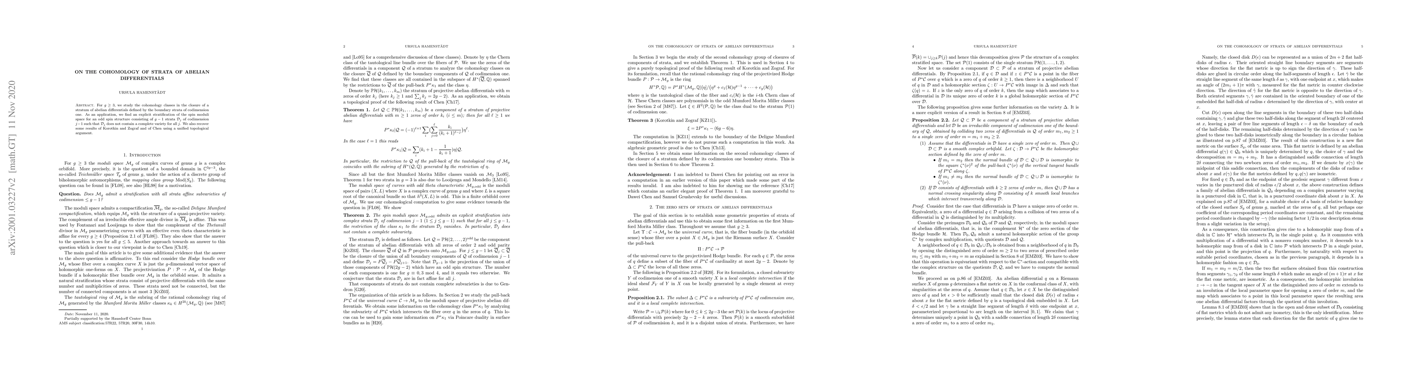 This paper investigates cohomology classes in strata of abelian differentials for genus g > 2, focusing on those defined by boundary strata of codimension one. It provides an explicit stratification of the spin moduli space for odd spin structures and unifies results from Koroktin, Zograf, and Chen through a new topological approach.