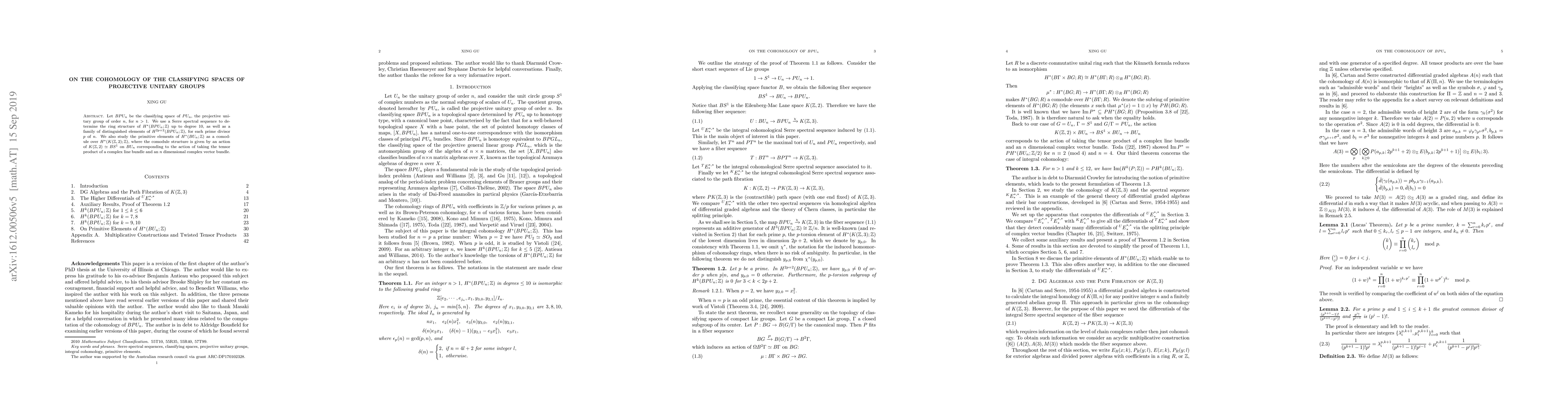 Let $\mathbf{B}PU_{n}$ be the classifying space of $PU_n$, the projective unitary group of order $n$, for $n>1$. We use the Serre spectral sequence associated to a fiber sequence $\mathbf{B}U_n\rightarrow\mathbf{B}PU_n\rightarrow K(\mathbb{Z},3)$ to determine the ring structure of $H^{*}(\mathbf{B}PU_{n}; \mathbb{Z})$ up to degree $10$, as well as a family of distinguished elements of $H^{2p+2}(\mathbf{B}PU_{n}; \mathbb{Z})$, for each prime divisor $p$ of $n$. We also study the primitive elements of $H^*(\mathbf{B}U_n;\mathbb{Z})$ as a comodule over $H^*(K(\mathbb{Z},2);\mathbb{Z})$, where the comodule structure is given by an action of $K(\mathbb{Z},2)\simeq\mathbf{B}S^1$ on $BU_n$ corresponding to the action of taking the tensor product of a complex line bundle and an $n$ dimensional complex vector bundle.