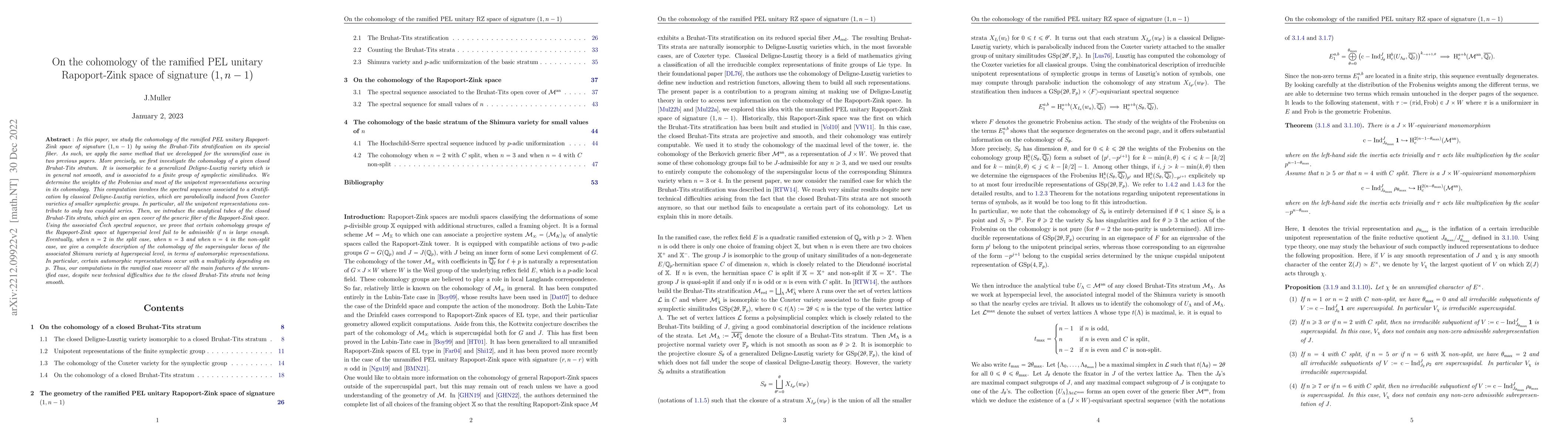 This paper investigates the cohomology of the ramified PEL unitary Rapoport-Zink space of signature $(1,n-1)$ using the Bruhat-Tits stratification. It determines the weights of Frobenius and unipotent representations in the cohomology, showing that unipotent representations contribute to only two cuspidal series.