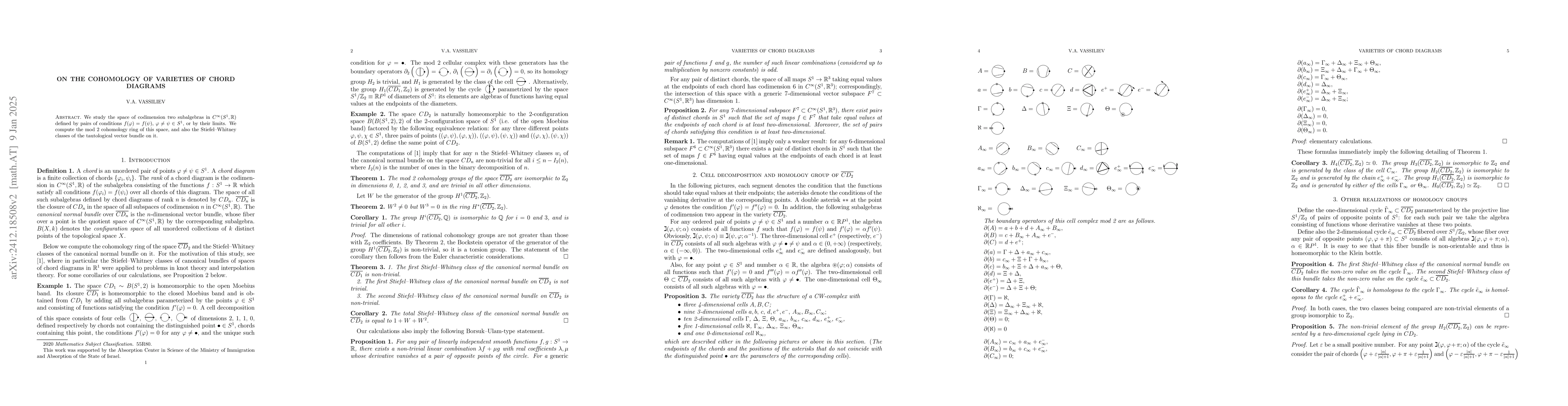 The paper investigates the cohomology of spaces of chord diagrams on the circle, determining the mod 2 cohomology ring and computing the Stiefel-Whitney classes of the associated tautological vector bundle.