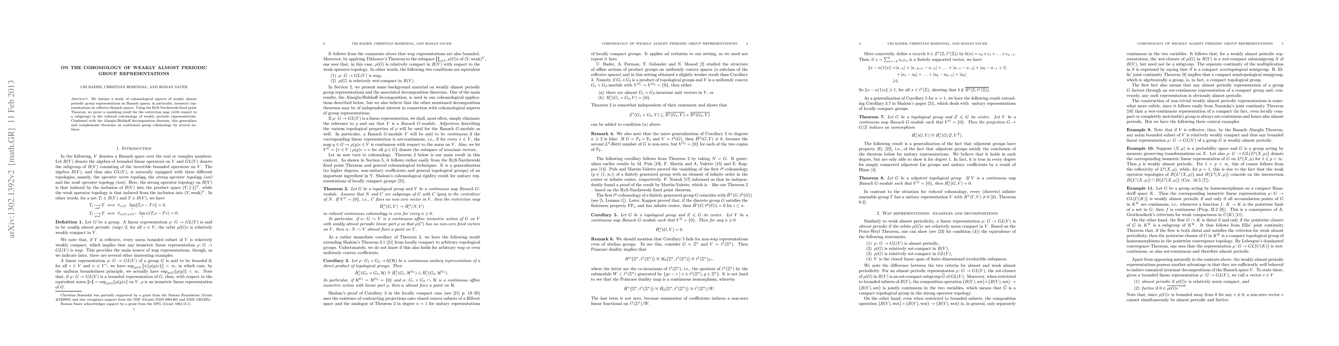 We initiate a study of cohomological aspects of weakly almost periodic group representations on Banach spaces, in particular, isometric representations on reflexive Banach spaces. Using the Ryll-Nardzewski fixed point Theorem, we prove a vanishing result for the restriction map (with respect to a subgroup) in the reduced cohomology of weakly periodic representations. Combined with the Alaoglu-Birkhoff decomposition theorem, this generalizes and complements theorems on continuous group cohomology by several authors.
