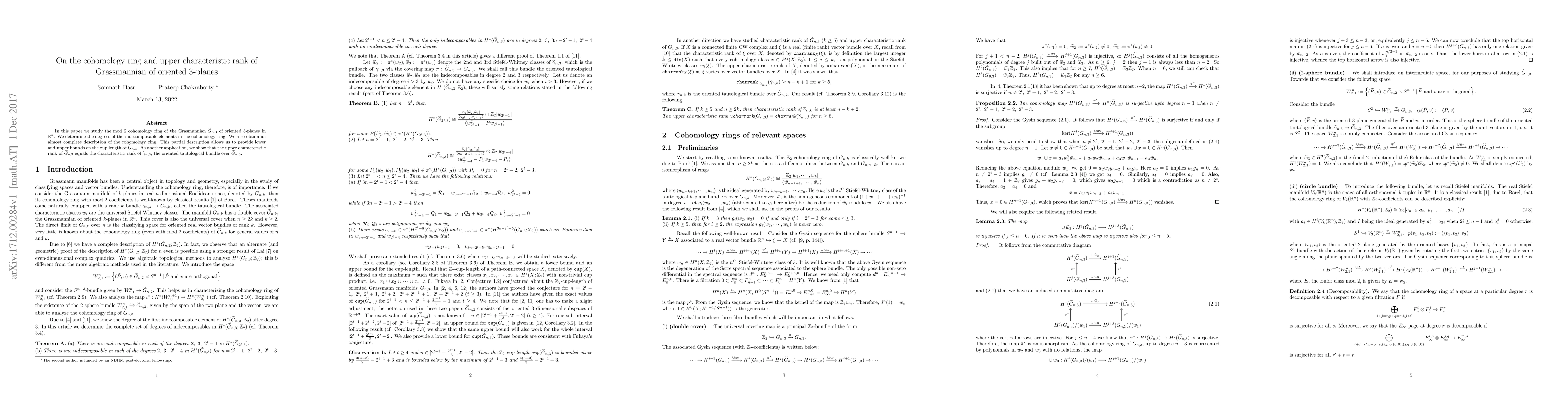 This paper investigates the mod 2 cohomology ring of the Grassmannian $\widetilde{G}_{n,3}$ of oriented 3-planes in $\mathbb{R}^n$, determining the degrees of its indecomposable elements and providing bounds on its cup length. It also establishes the equivalence of the upper characteristic rank of $\widetilde{G}_{n,3}$ with the characteristic rank of the oriented tautological bundle $\widetilde{\gamma}_{n,3}$.