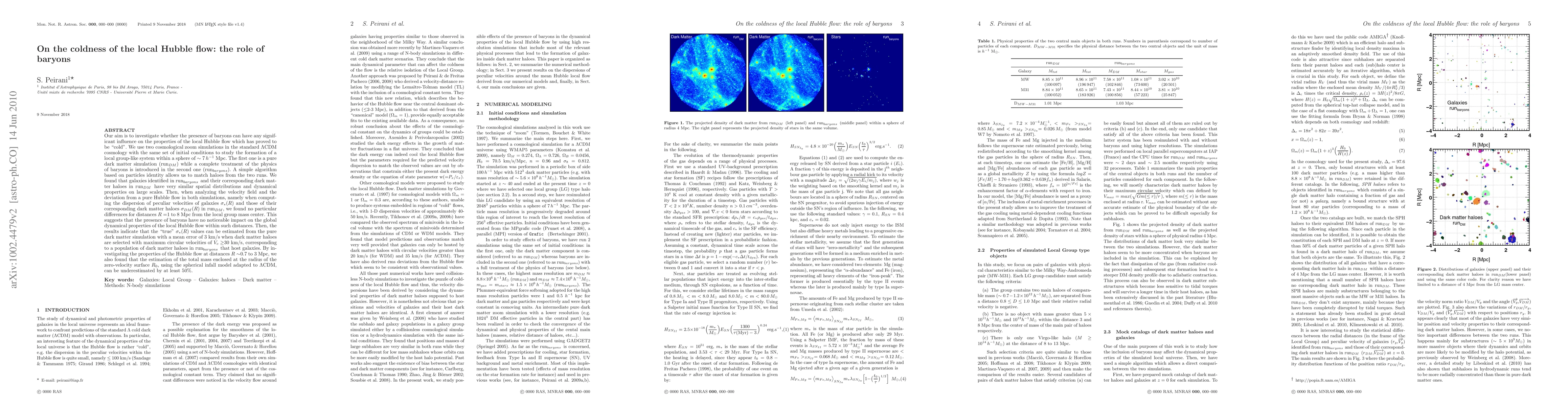 (Abridged) Our aim is to investigate whether the presence of baryons can have any significant influence on the properties of the local Hubble flow which has proved to be "cold". We use two cosmological zoom simulations in the standard LCDM cosmology with the same set of initial conditions to study the formation of a local group-like system within a sphere of ~7 Mpc/h. The first one is a pure dark matter simulation (runDM) while a complete treatment of the physics of baryons is introduced in the second one (runB). We found that galaxies identified in runB and their corresponding dark matter haloes in runDM have very similar spatial distributions and dynamical properties on large scales. Then, when analyzing the velocity field and the deviation from a pure Hubble flow in both simulations, namely when computing the dispersion of peculiar velocities of galaxies \sigma*(R) and those of their corresponding dark matter haloes in runDM, we found no particular differences for distances R=1 to 8 Mpc from the local group mass center. The results indicate that the "true" \sigma*(R) values can be estimated from the pure dark matter simulation with a mean error of 3 km/s when dark matter haloes are selected with maximum circular velocities of Vc$\ge$30 km/s, corresponding to a population of dark matter haloes in runB that host galaxies. By investigating the properties of the Hubble flow at distances R~0.7 to 3 Mpc, we also found that the estimation of the total mass enclosed at the radius of the zero-velocity surface R0, using the spherical infall model adapted to LCDM, can be underestimated by at least 50%.
