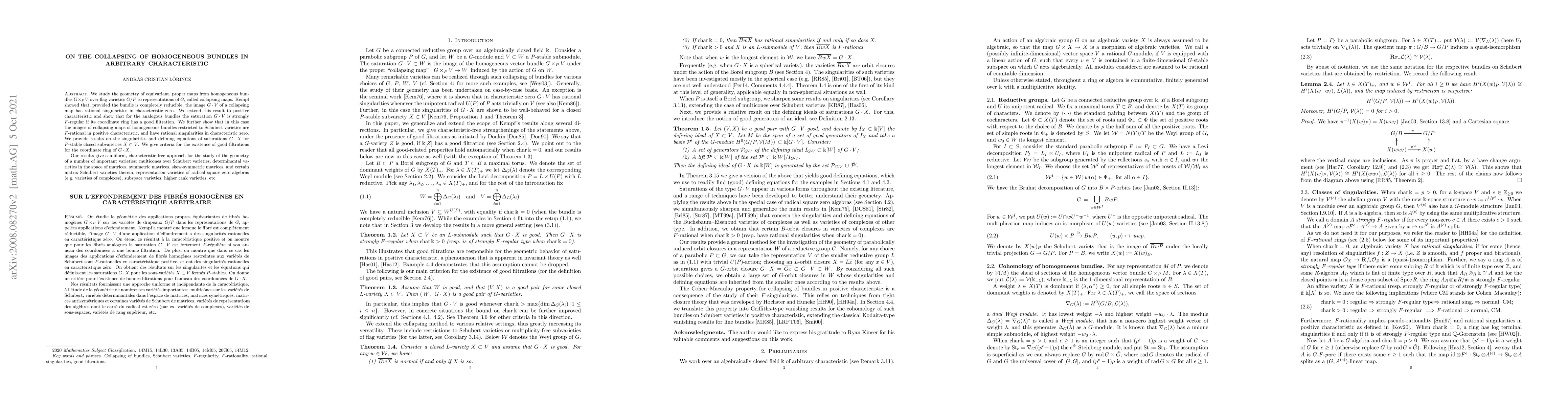 We study the geometry of equivariant, proper maps from homogeneous bundles $G\times_P V$ over flag varieties $G/P$ to representations of $G$, called collapsing maps. Kempf showed that, provided the bundle is completely reducible, the image $G\cdot V$ of a collapsing map has rational singularities in characteristic zero. We extend this result to positive characteristic and show that for the analogous bundles the saturation $G\cdot V$ is strongly $F$-regular if its coordinate ring has a good filtration. We further show that in this case the images of collapsing maps of homogeneous bundles restricted to Schubert varieties are $F$-rational in positive characteristic, and have rational singularities in characteristic zero. We provide results on the singularities and defining equations of saturations $G\cdot X$ for $P$-stable closed subvarieties $X\subset V$. We give criteria for the existence of good filtrations for the coordinate ring of $G\cdot X$. Our results give a uniform, characteristic-free approach for the study of the geometry of a number of important varieties: multicones over Schubert varieties, determinantal varieties in the space of matrices, symmetric matrices, skew-symmetric matrices, and certain matrix Schubert varieties therein, representation varieties of radical square zero algebras (e.g. varieties of complexes), subspace varieties, higher rank varieties, etc.