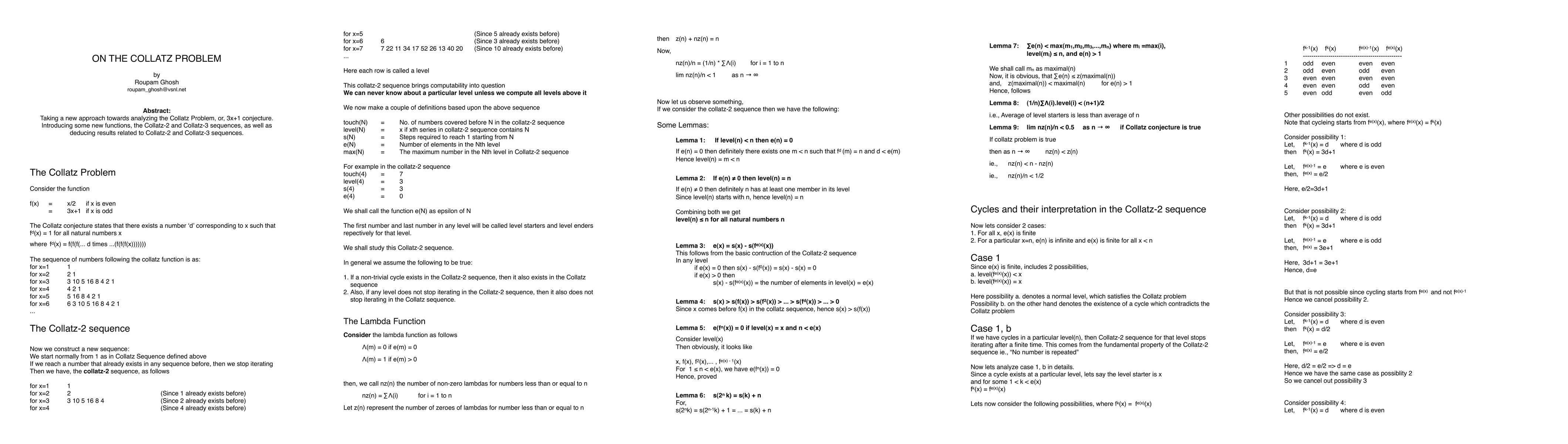 Taking a new approach towards analyzing the Collatz Problem, or, 3x+1 conjecture. Introducing some new functions, the Collatz-2 and Collatz-3 sequences, as well as deducing results related to Collatz-2 and Collatz-3 sequences.