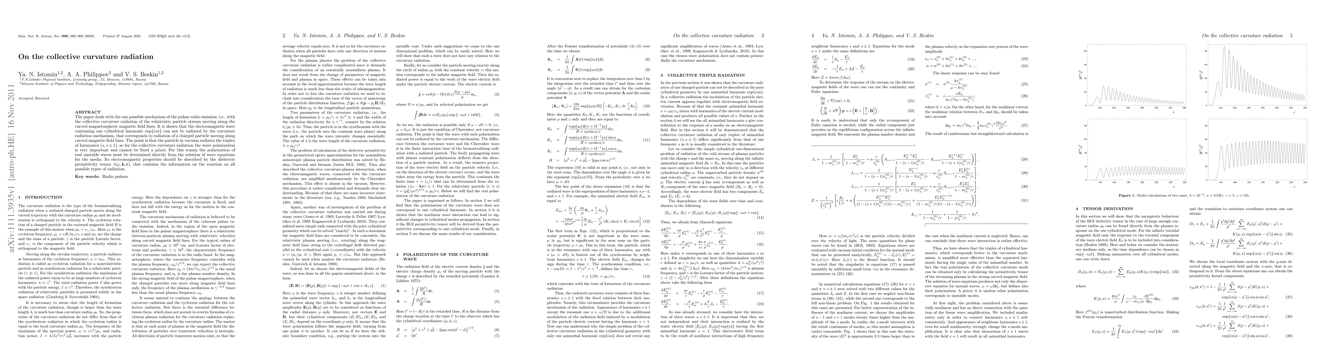 The paper deals with the one possible mechanism of the pulsar radio emission, i.e., with the collective curvature radiation of the relativistic particle stream moving along the curved magnetospheric magnetic field lines. It is shown that the electromagnetic wave containing one cylindrical harmonic exp{is{\phi}} can not be radiated by the curvature radiation mechanism, that corresponds to radiation of a charged particle moving along curved magnetic field lines. The point is that the particle in vacuum radiates the triplex of harmonics (s, s \pm 1), so for the collective curvature radiation the wave polarization is very important and cannot be fixed a priori. For this reason the polarization of real unstable waves must be determined directly from the solution of wave equations for the media. Its electromagnetic properties should be described by the dielectric permittivity tensor \^{\epsilon}({\omega},k,r), that contains the information on the reaction on all possible types of radiation.