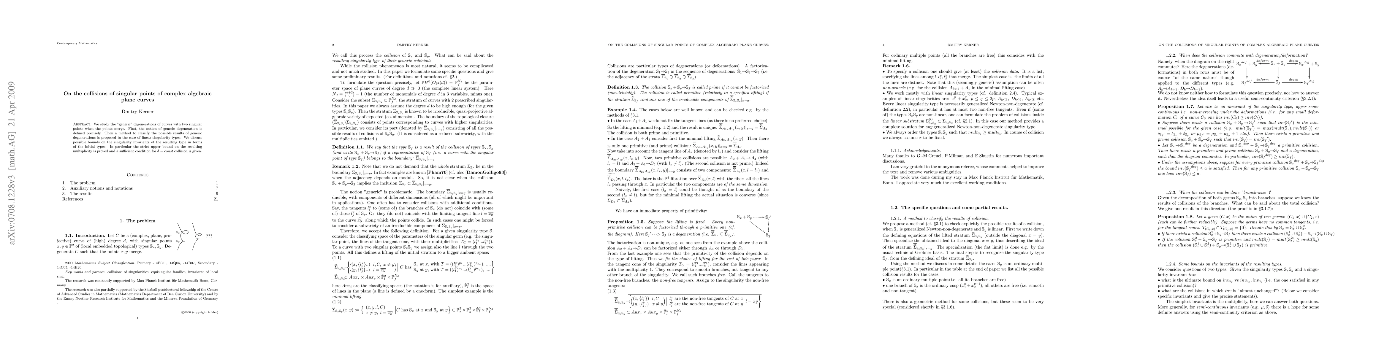 This paper investigates the degenerations of complex algebraic plane curves with two singular points as they merge, defining "generic" degenerations and proposing a classification method for linear singularity types. It establishes a strict upper bound on the multiplicity of the resulting singularities and provides a condition for constant delta during collisions.
