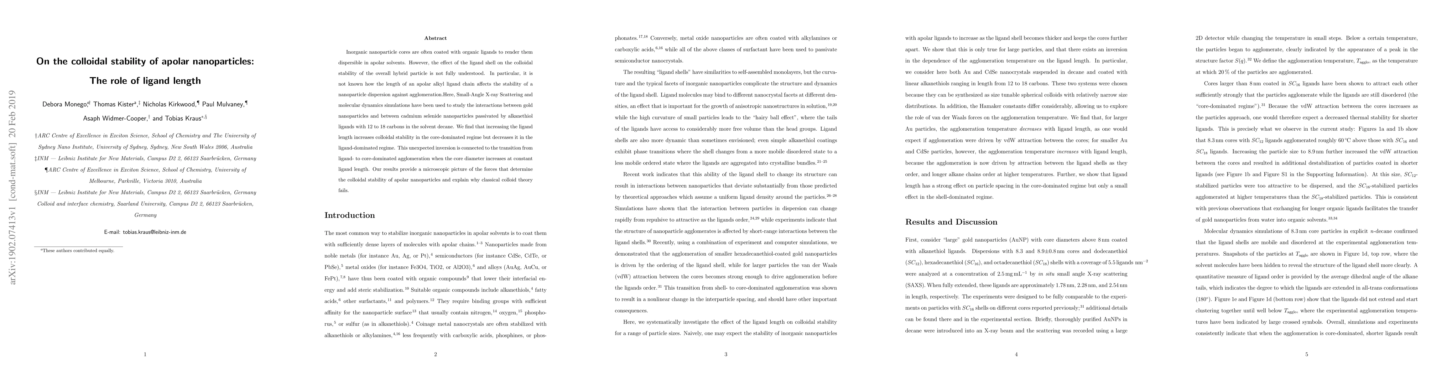 This paper investigates how the length of apolar alkyl ligands affects the colloidal stability of nanoparticles in apolar solvents, finding that longer ligands enhance stability in the core-dominated regime but reduce it in the ligand-dominated regime, revealing a transition that challenges classical colloid theory.