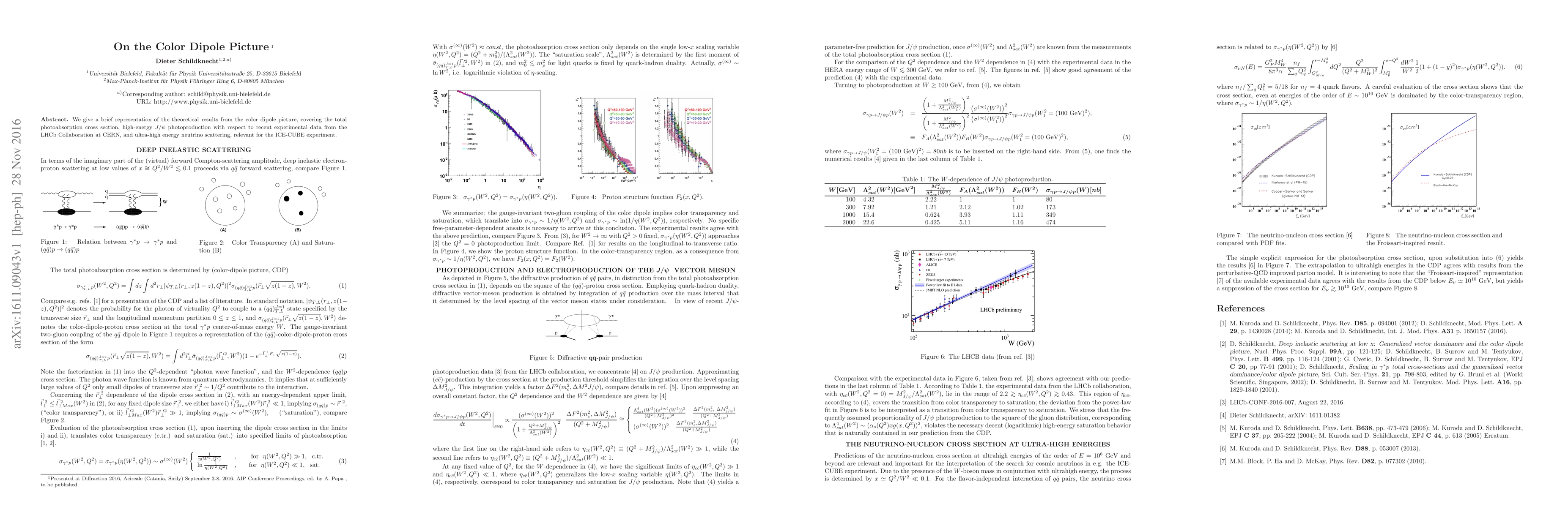 This paper summarizes theoretical findings from the color dipole picture, focusing on the total photoabsorption cross section, high-energy $J/\psi$ photoproduction in line with LHCb experimental data, and ultra-high energy neutrino scattering relevant to the ICE-CUBE experiment.