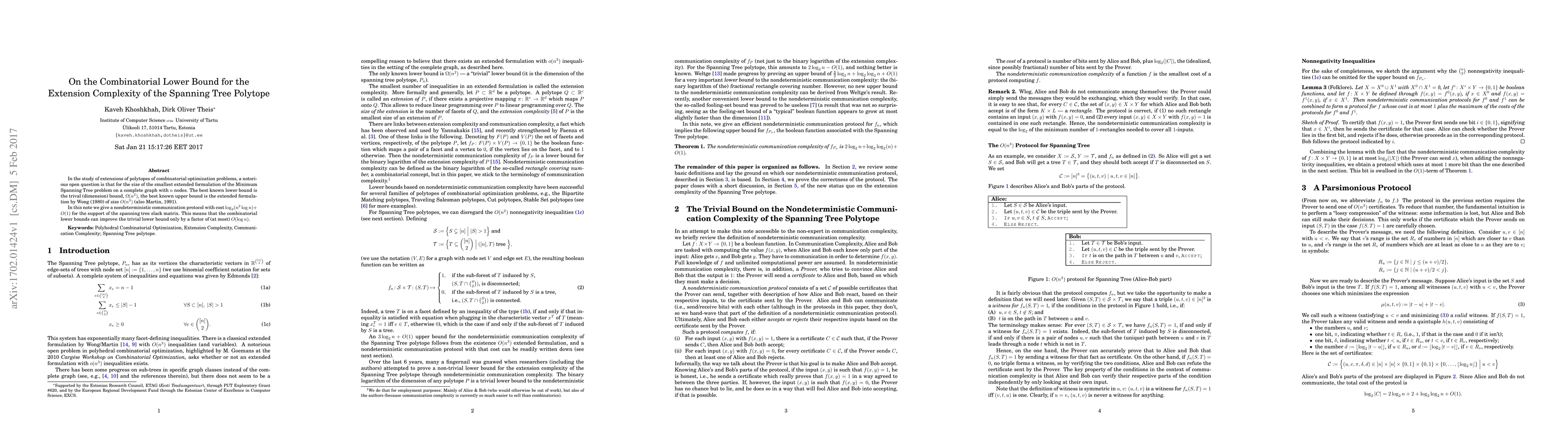 This paper addresses the extension complexity of the spanning tree polytope, proposing a nondeterministic communication protocol that improves the trivial lower bound for the smallest extended formulation size by a factor of at most $O(\log n)$. The best known upper bound remains $O(n^3)$ from Wong (1980).