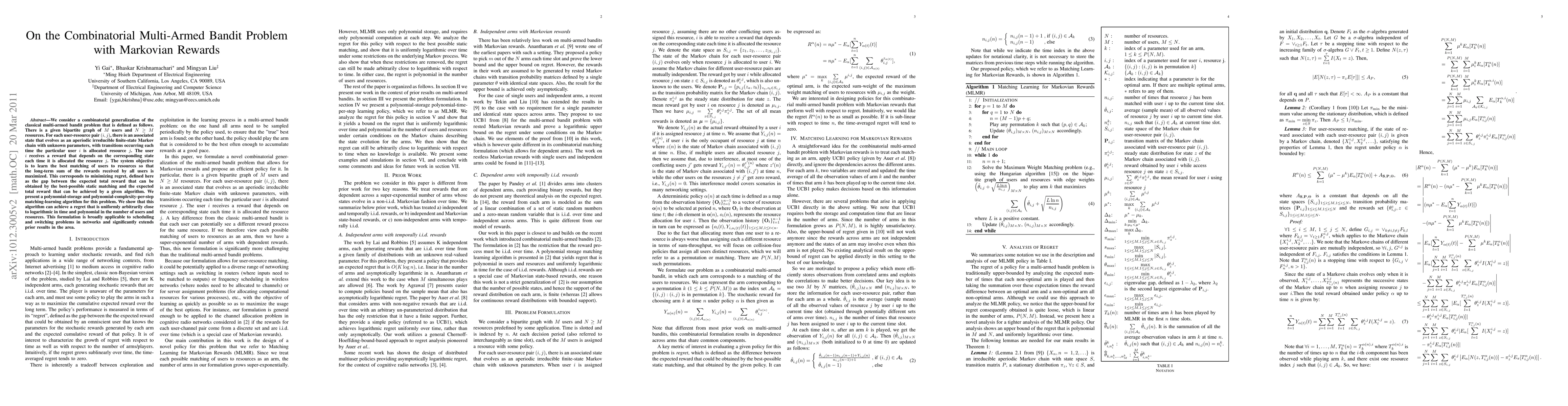 This paper introduces a solution for the Combinatorial Multi-Armed Bandit Problem with Markovian Rewards, where users are matched to resources in a bipartite graph. The matching's goal is to maximize long-term rewards, minimizing regret. A polynomial-time, polynomial-storage algorithm is presented, demonstrating near-logarithmic regret over time, applicable to network scheduling and switching problems.