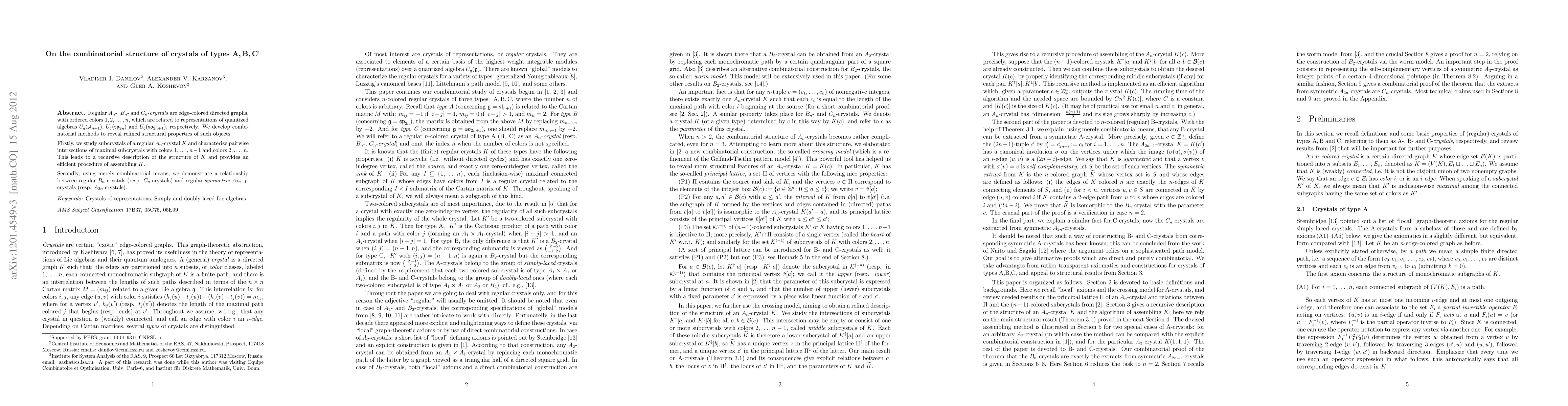 Regular $A_n$-, $B_n$- and $C_n$-crystals are edge-colored directed graphs, with ordered colors $1,2,...,n$, which are related to representations of quantized algebras $U_q(\mathfrak{sl}_{n+1})$, $U_q(\mathfrak{sp}_{2n})$ and $U_q(\mathfrak{so}_{2n+1})$, respectively. We develop combinatorial methods to reveal refined structural properties of such objects. Firstly, we study subcrystals of a regular $A_n$-crystal $K$ and characterize pairwise intersections of maximal subcrystals with colors $1,...,n-1$ and colors $2,...,n$. This leads to a recursive description of the structure of $K$ and provides an efficient procedure of assembling $K$. Secondly, using merely combinatorial means, we demonstrate a relationship between regular $B_n$-crystals (resp. $C_n$-crystals) and regular symmetric $A_{2n-1}$-crystals (resp. $A_{2n}$-crystals).