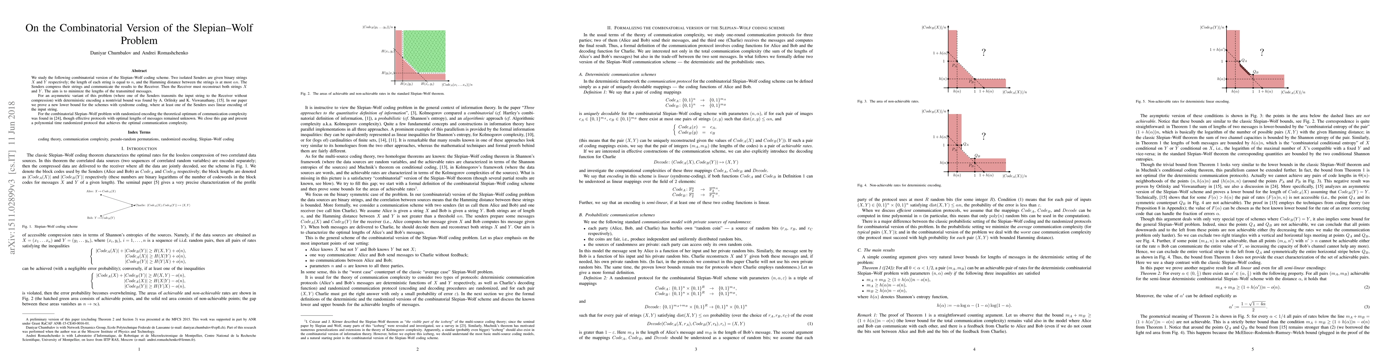 We study the following combinatorial version of the Slepian-Wolf coding scheme. Two isolated Senders are given binary strings $X$ and $Y$ respectively; the length of each string is equal to $n$, and the Hamming distance between the strings is at most $\alpha n$. The Senders compress their strings and communicate the results to the Receiver. Then the Receiver must reconstruct both strings $X$ and $Y$. The aim is to minimise the lengths of the transmitted messages. For an asymmetric variant of this problem (where one of the Senders transmits the input string to the Receiver without compression) with deterministic encoding a nontrivial lower bound was found by A.Orlitsky and K.Viswanathany. In our paper we prove a new lower bound for the schemes with syndrome coding, where at least one of the Senders uses linear encoding of the input string. For the combinatorial Slepian-Wolf problem with randomized encoding the theoretical optimum of communication complexity was recently found by the first author, though effective protocols with optimal lengths of messages remained unknown. We close this gap and present a polynomial time randomized protocol that achieves the optimal communication complexity.