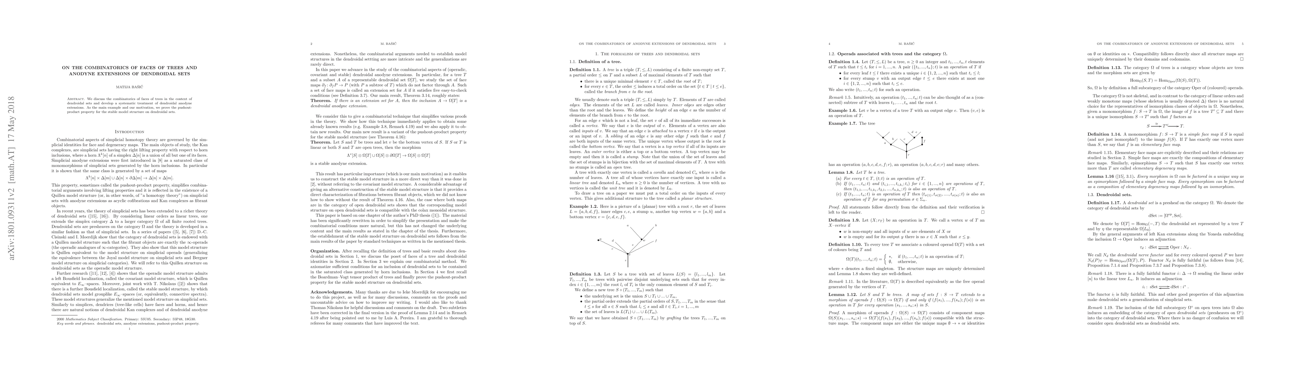 This paper explores combinatorics of tree faces in dendroidal sets and develops a systematic treatment of anodyne extensions, proving the pushout-product property for stable model structures on these sets.