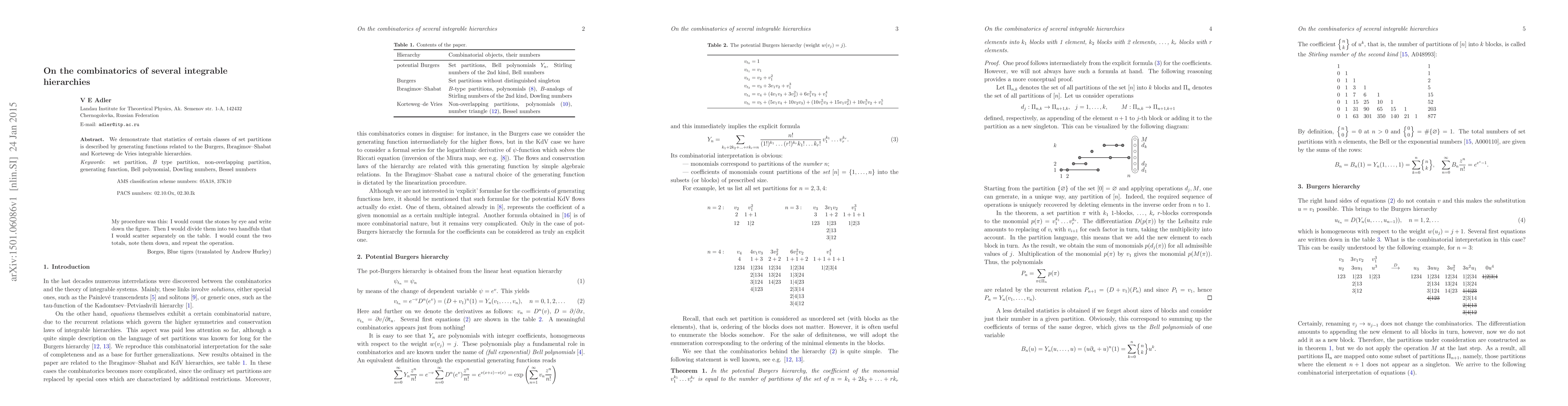 We demonstrate that statistics of certain classes of set partitions is described by generating functions related to the Burgers, Ibragimov--Shabat and Korteweg--de Vries integrable hierarchies.