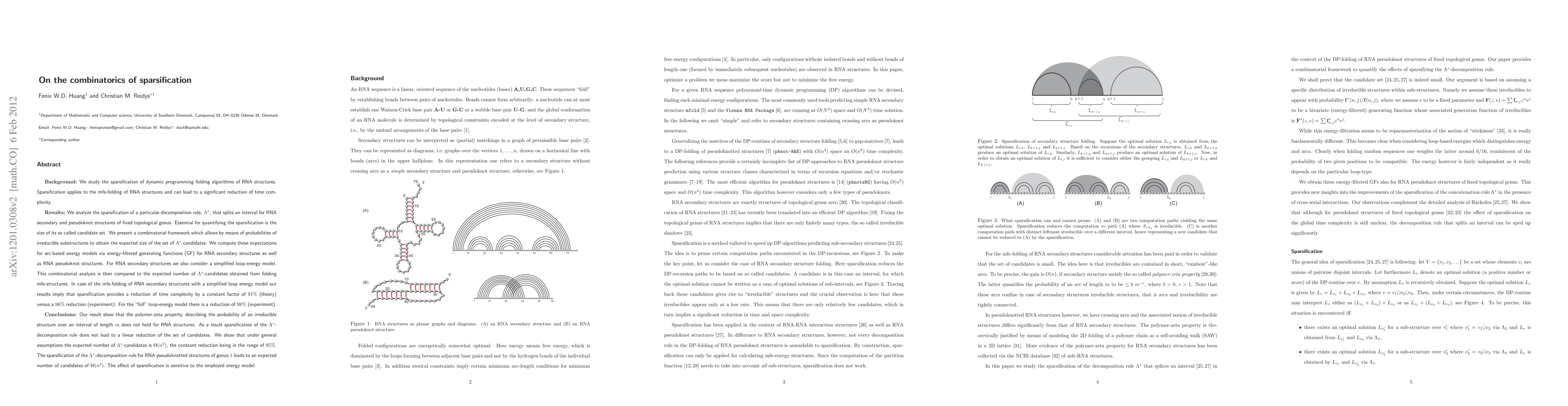 Background: We study the sparsification of dynamic programming folding algorithms of RNA structures. Sparsification applies to the mfe-folding of RNA structures and can lead to a significant reduction of time complexity. Results: We analyze the sparsification of a particular decomposition rule, $\Lambda^*$, that splits an interval for RNA secondary and pseudoknot structures of fixed topological genus. Essential for quantifying the sparsification is the size of its so called candidate set. We present a combinatorial framework which allows by means of probabilities of irreducible substructures to obtain the expected size of the set of $\Lambda^*$-candidates. We compute these expectations for arc-based energy models via energy-filtered generating functions (GF) for RNA secondary structures as well as RNA pseudoknot structures. For RNA secondary structures we also consider a simplified loop-energy model. This combinatorial analysis is then compared to the expected number of $\Lambda^*$-candidates obtained from folding mfe-structures. In case of the mfe-folding of RNA secondary structures with a simplified loop energy model our results imply that sparsification provides a reduction of time complexity by a constant factor of 91% (theory) versus a 96% reduction (experiment). For the "full" loop-energy model there is a reduction of 98% (experiment).
