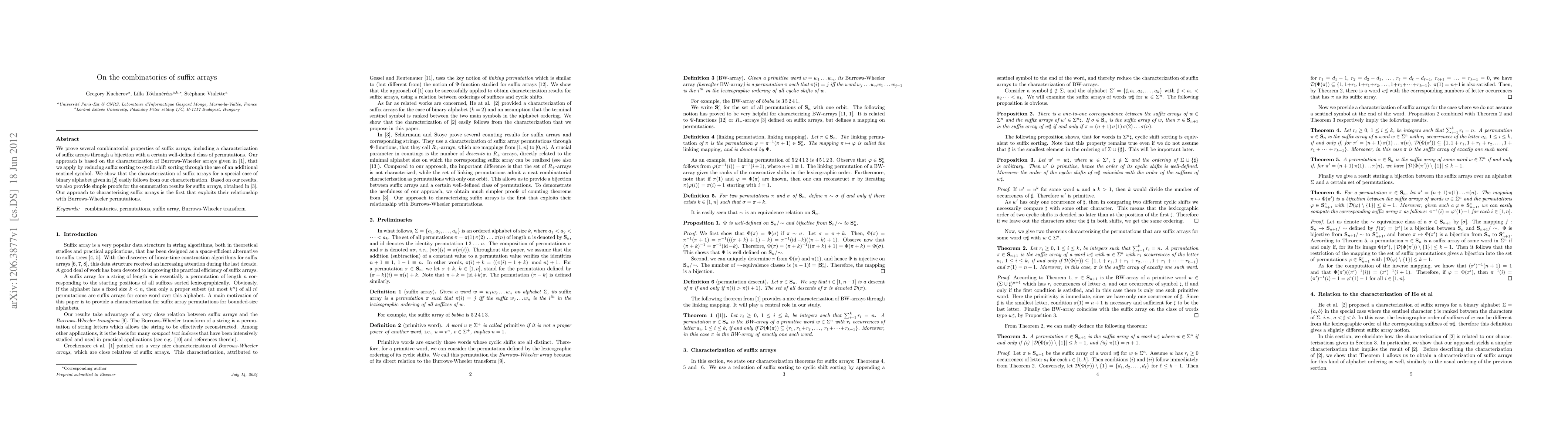 This paper establishes combinatorial properties of suffix arrays through a bijection with a specific class of permutations, leveraging the characterization of Burrows-Wheeler arrays. It also simplifies enumeration results for suffix arrays and extends the characterization to binary alphabets.