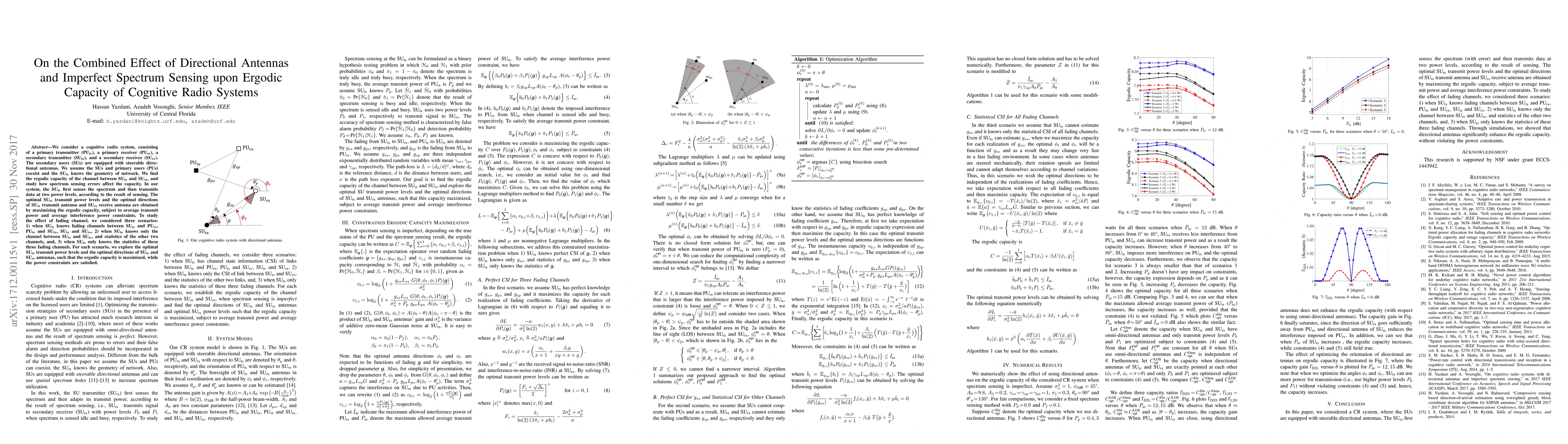 We consider a cognitive radio system, consisting of a primary transmitter (PUtx), a primary receiver (PUrx), a secondary transmitter (SUtx), and a secondary receiver (SUrx). The secondary users (SUs) are equipped with steerable directional antennas. We assume the SUs and primary users (PUs) coexist and the SUtx knows the geometry of network. We find the ergodic capacity of the channel between SUtx and SUrx , and study how spectrum sensing errors affect the capacity. In our system, the SUtx first senses the spectrum and then transmits data at two power levels, according to the result of sensing. The optimal SUtx transmit power levels and the optimal directions of SUtx transmit antenna and SUrx receive antenna are obtained by maximizing the ergodic capacity, subject to average transmit power and average interference power constraints. To study the effect of fading channel, we considered three scenarios: 1) when SUtx knows fading channels between SUtx and PUrx, PUtx and SUrx, SUtx and SUrx, 2) when SUtx knows only the channel between SUtx and SUrx, and statistics of the other two channels, and, 3) when SUtx only knows the statistics of these three fading channels. For each scenario, we explore the optimal SUtx transmit power levels and the optimal directions of SUtx and SUrx antennas, such that the ergodic capacity is maximized, while the power constraints are satisfied.
