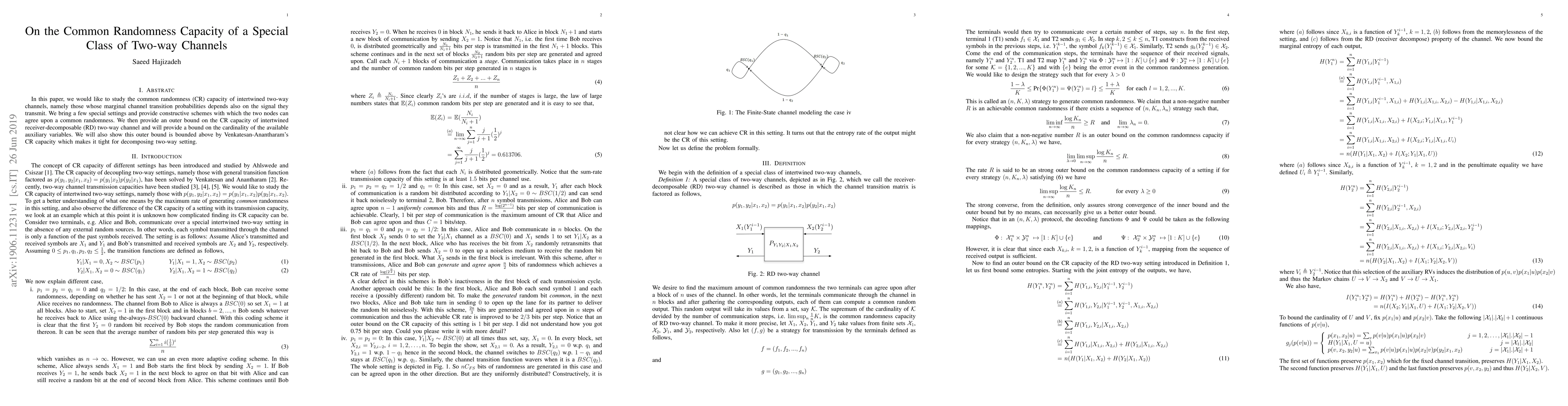 This paper investigates the common randomness capacity of intertwined two-way channels where marginal probabilities depend on transmitted signals. It proposes constructive schemes for nodes to agree on shared randomness and provides an outer bound on the CR capacity for intertwined receiver-decomposable channels, showing it is tight relative to Venkatesan-Anantharam's bound.