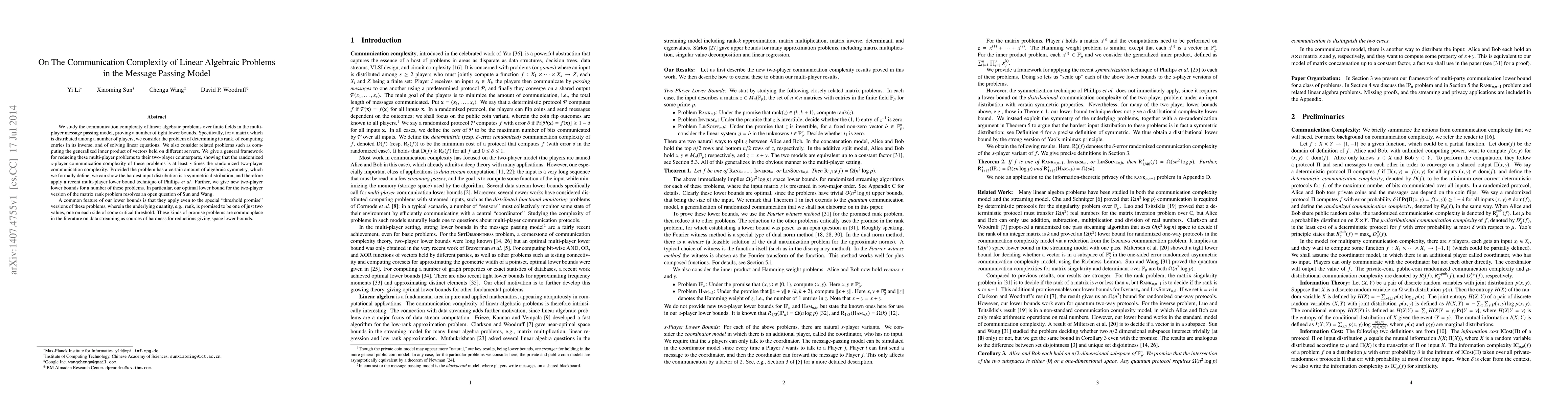 We study the communication complexity of linear algebraic problems over finite fields in the multi-player message passing model, proving a number of tight lower bounds. Specifically, for a matrix which is distributed among a number of players, we consider the problem of determining its rank, of computing entries in its inverse, and of solving linear equations. We also consider related problems such as computing the generalized inner product of vectors held on different servers. We give a general framework for reducing these multi-player problems to their two-player counterparts, showing that the randomized $s$-player communication complexity of these problems is at least $s$ times the randomized two-player communication complexity. Provided the problem has a certain amount of algebraic symmetry, which we formally define, we can show the hardest input distribution is a symmetric distribution, and therefore apply a recent multi-player lower bound technique of Phillips et al. Further, we give new two-player lower bounds for a number of these problems. In particular, our optimal lower bound for the two-player version of the matrix rank problem resolves an open question of Sun and Wang. A common feature of our lower bounds is that they apply even to the special "threshold promise" versions of these problems, wherein the underlying quantity, e.g., rank, is promised to be one of just two values, one on each side of some critical threshold. These kinds of promise problems are commonplace in the literature on data streaming as sources of hardness for reductions giving space lower bounds.