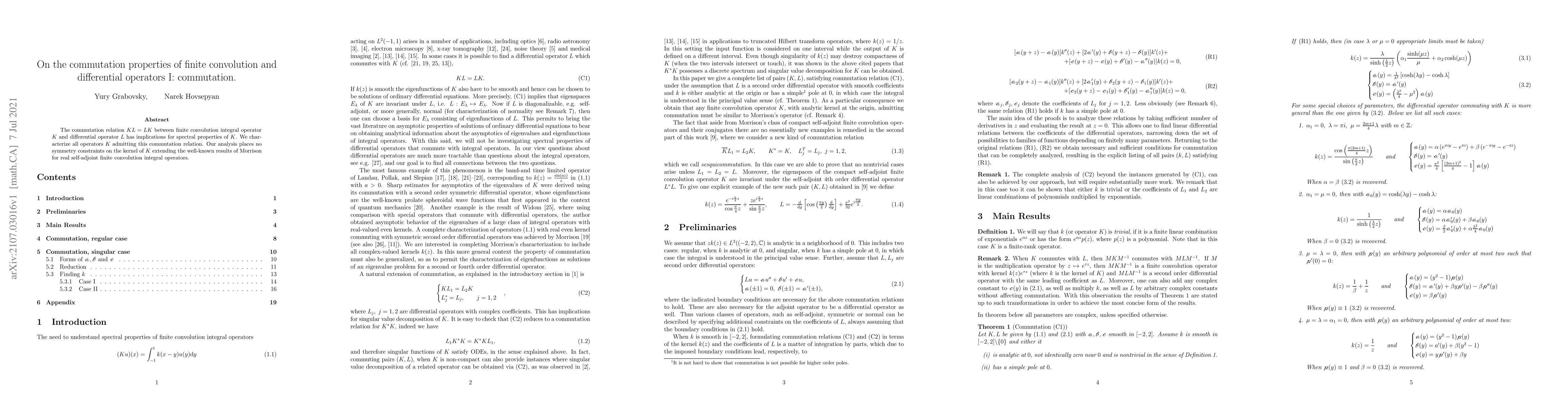 Spectral properties of many finite convolution integral operators have been understood by finding differential operators that commute with them. In this paper we compile a complete list of such commuting pairs, extending previous work to complex-valued and non self-adjoint operators. In addition, we introduce a new kind of commutation relation, which we call sesquicommutation, that also has implications for the spectral properties of the integral operator. In this case we also compute a complete list of sequicommuting pairs of integral and differential operators.