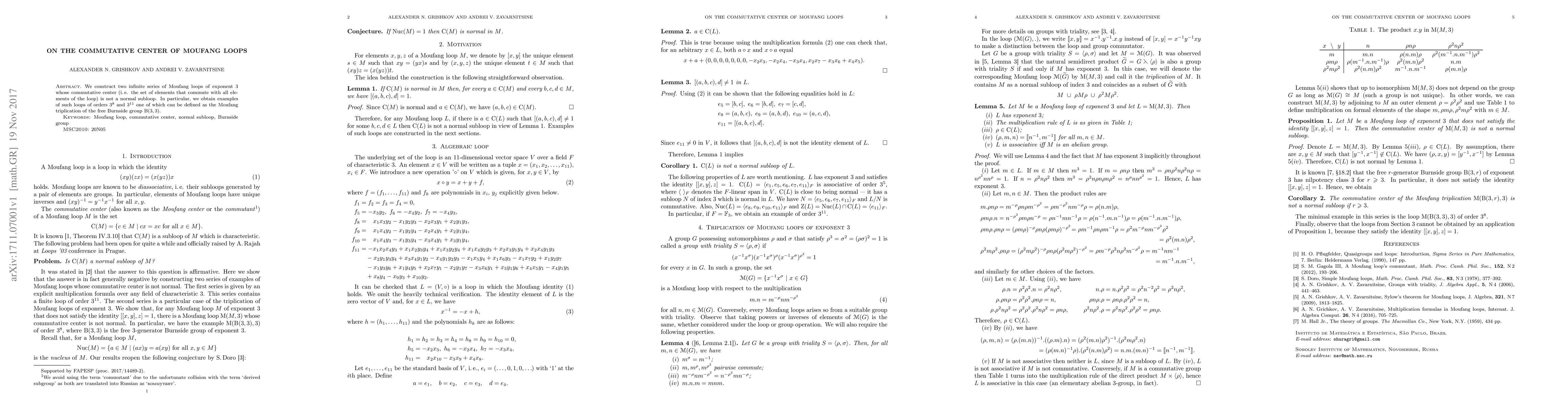 We construct two infinite series of Moufang loops of exponent $3$ whose commutative center (i.e. the set of elements that commute with all elements of the loop) is not a normal subloop. In particular, we obtain examples of such loops of orders $3^8$ and $3^{11}$ one of which can be defined as the Moufang triplication of the free Burnside group $B(3,3)$.