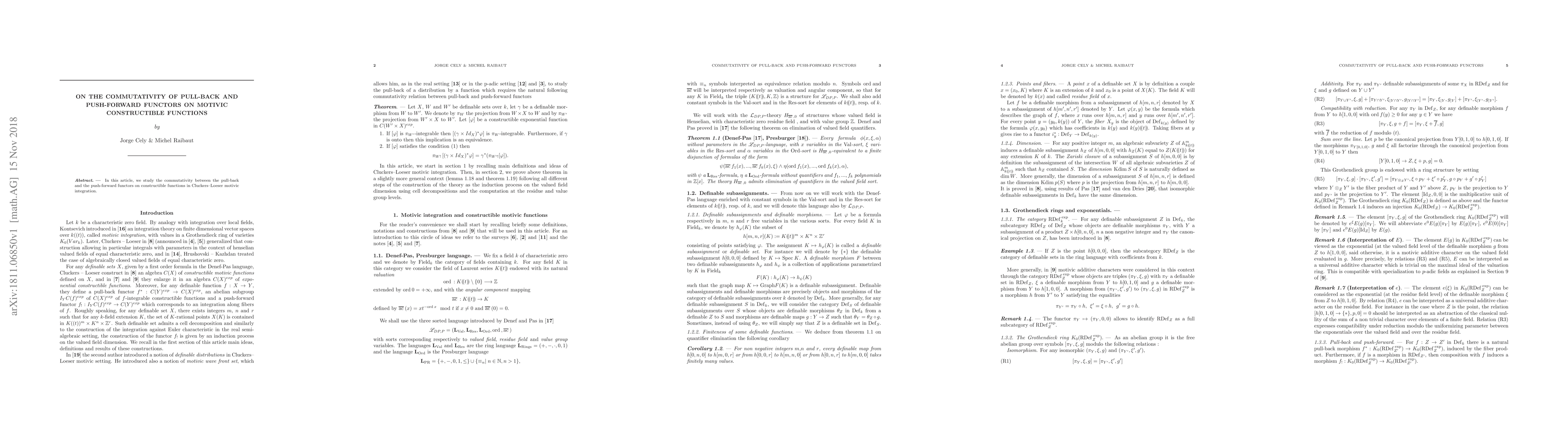 This paper explores the relationship between pull-back and push-forward functors on constructible functions within Cluckers-Loeser motivic integration, finding conditions under which they commute.