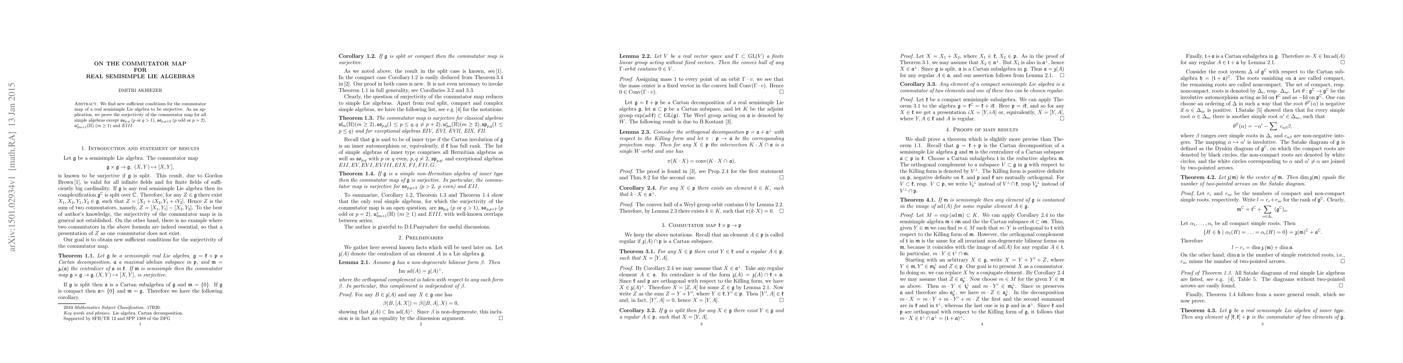 We find new sufficient conditions for the commutator map of a real semisimple Lie algebra to be surjective. As an application we prove the surjectivity of the commutator map for all simple algebras except $\mathfrak su_{p,q}$ ($p$ or $q$ >1), $\mathfrak so_{p,p+2}$ ($p$ odd or $p=2$), $\mathfrak u^*_{2m+1}(\mathbb H)$ ($m\ge 1$) and $EIII$.