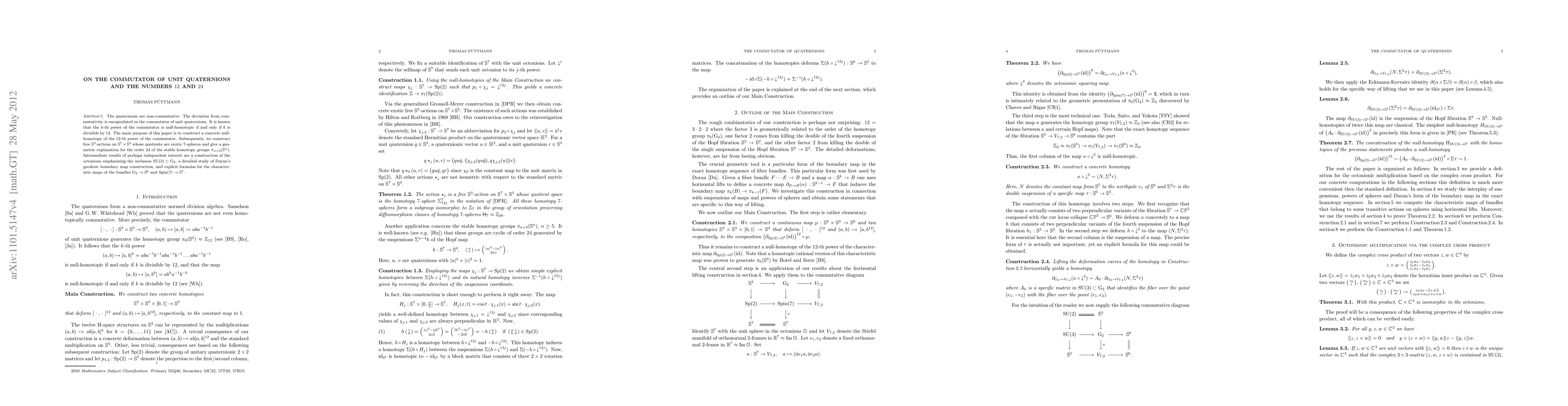 The quaternions are non-commutative. The deviation from commutativity is encapsulated in the commutator of unit quaternions. It is known that the k-th power of the commutator is null-homotopic if and only if k is divisible by 12. The main purpose of this paper is to construct a concrete null-homotopy of the 12-th power of the commutator. Subsequently, we construct free S^3-actions on S^7 x S^3 whose quotients are exotic 7-sphere and give a geometric explanation for the order of the stable homotopy groups \pi_{n+3} (S^n). Intermediate results of perhaps independent interest are a construction of the octonions emphasizing the inclusion SU(3) \subset G_2, a detailed study of Duran's geodesic boundary map construction, and explicit formulas for the characteristic maps of the bundles G_2 \to S^6 and Spin(7) \to S^7.