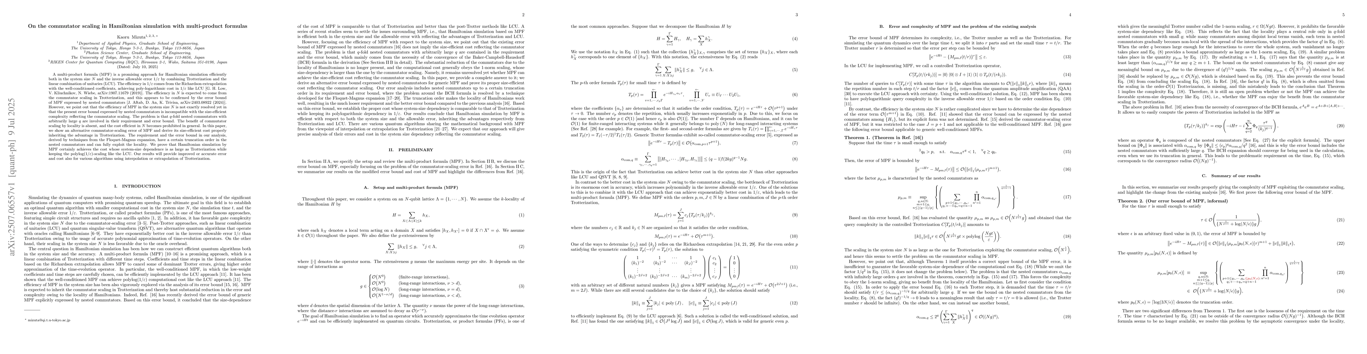 A multi-product formula (MPF) is a promising approach for Hamiltonian simulation efficiently both in the system size $N$ and the inverse allowable error $1/\varepsilon$ by combining Trotterization and the linear combination of unitaries (LCU). It achieves poly-logarithmic cost in $1/\varepsilon$ like LCU [G. H. Low, V. Kliuchnikov, N. Wiebe, arXiv:1907.11679 (2019)]. The efficiency in $N$ is expected to come from the commutator scaling in Trotterization, and this appears to be confirmed by the error bound of MPF expressed by nested commutators [J. Aftab, D. An, K. Trivisa, arXiv:2403.08922 (2024)]. However, we point out that the efficiency of MPF in the system size $N$ is not exactly resolved yet in that the present error bound expressed by nested commutators is incompatible with the size-efficient complexity reflecting the commutator scaling. The problem is that $q$-fold nested commutators with arbitrarily large $q$ are involved in their requirement and error bound. The benefit of commutator scaling by locality is absent, and the cost efficient in $N$ becomes prohibited in general. In this paper, we show an alternative commutator-scaling error of MPF and derive its size-efficient cost properly inheriting the advantage in Trotterization. The requirement and the error bound in our analysis, derived by techniques from the Floquet-Magnus expansion, have a certain truncation order in the nested commutators and can fully exploit the locality. We prove that Hamiltonian simulation by MPF certainly achieves the cost whose system-size dependence is as large as Trotterization while keeping the $\mathrm{polylog}(1/\varepsilon)$-scaling like the LCU. Our results will provide improved or accurate error and cost also for various algorithms using interpolation or extrapolation of Trotterization.
