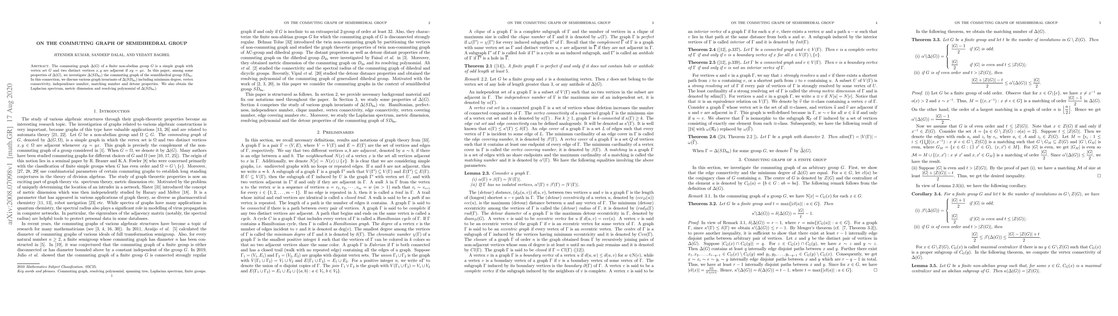 This paper studies the commuting graph $\Delta(SD_{8n})$ of the semidihedral group $SD_{8n}$, analyzing various graph invariants such as minimum degree, vertex connectivity, independence number, and matching number. It also determines the Laplacian spectrum, metric dimension, and resolving polynomial of $\Delta(SD_{8n})$.