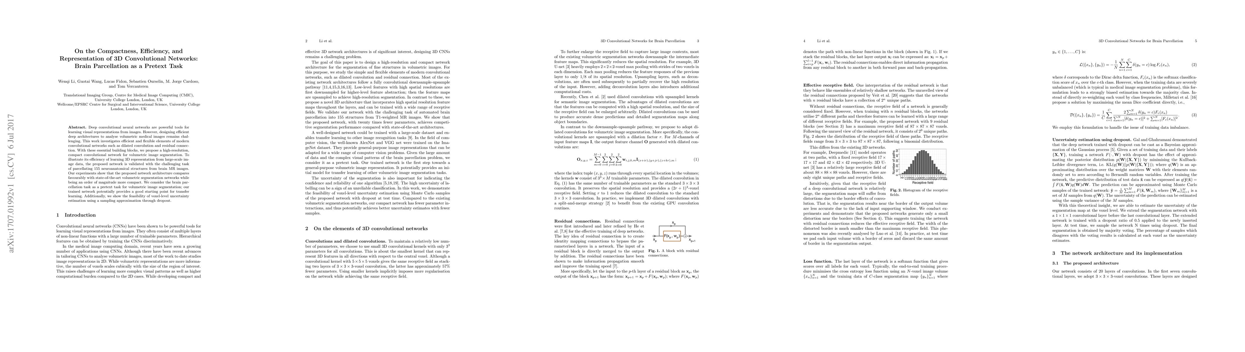 Deep convolutional neural networks are powerful tools for learning visual representations from images. However, designing efficient deep architectures to analyse volumetric medical images remains challenging. This work investigates efficient and flexible elements of modern convolutional networks such as dilated convolution and residual connection. With these essential building blocks, we propose a high-resolution, compact convolutional network for volumetric image segmentation. To illustrate its efficiency of learning 3D representation from large-scale image data, the proposed network is validated with the challenging task of parcellating 155 neuroanatomical structures from brain MR images. Our experiments show that the proposed network architecture compares favourably with state-of-the-art volumetric segmentation networks while being an order of magnitude more compact. We consider the brain parcellation task as a pretext task for volumetric image segmentation; our trained network potentially provides a good starting point for transfer learning. Additionally, we show the feasibility of voxel-level uncertainty estimation using a sampling approximation through dropout.