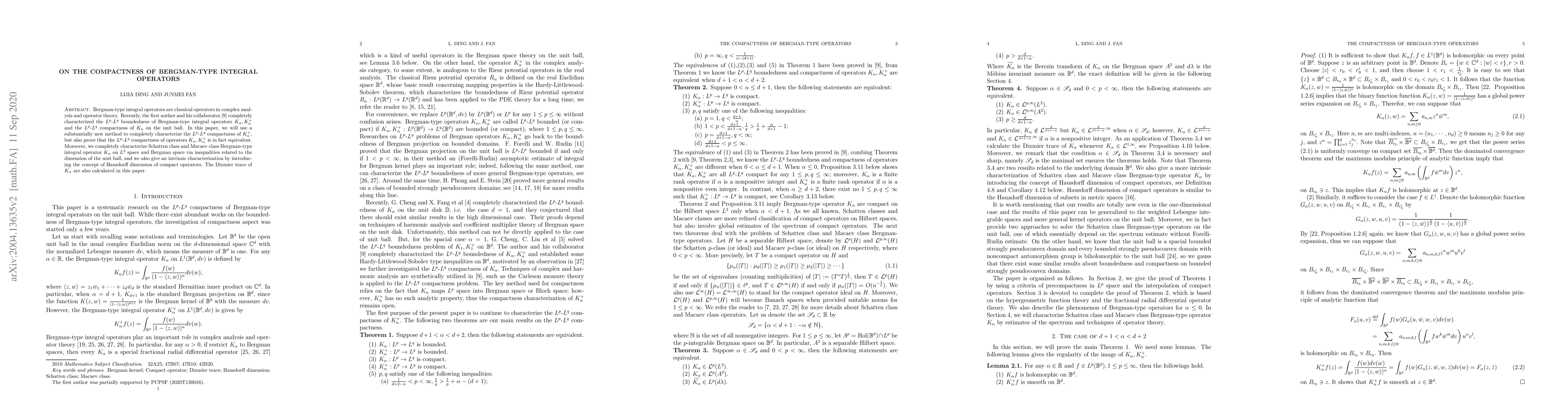 This paper characterizes the $L^p$-$L^q$ compactness of Bergman-type integral operators $K_\alpha$ and $K_\alpha^+$ and proves their equivalence. It also introduces Hausdorff dimension for compact operators and calculates the Dixmier trace, providing a comprehensive analysis of these operators in $L^2$ and Bergman spaces.