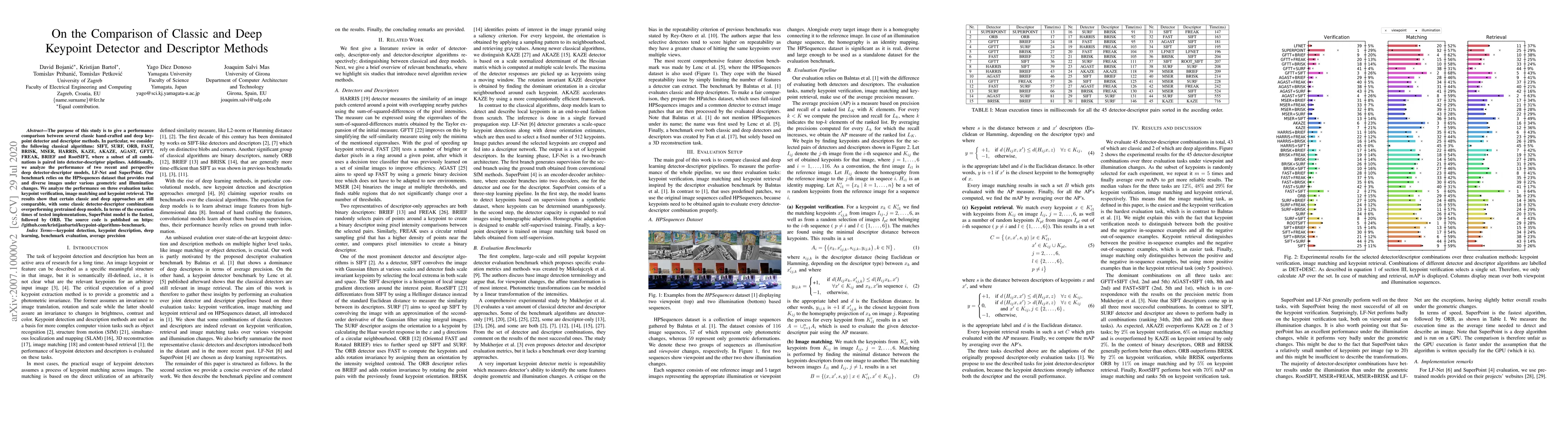 This study compares classic hand-crafted and deep keypoint detector-descriptor methods using the HPSequences dataset, evaluating performance in keypoint verification, image matching, and keypoint retrieval. While some classic methods outperform deep models, SuperPoint is the fastest, with ORB close behind.