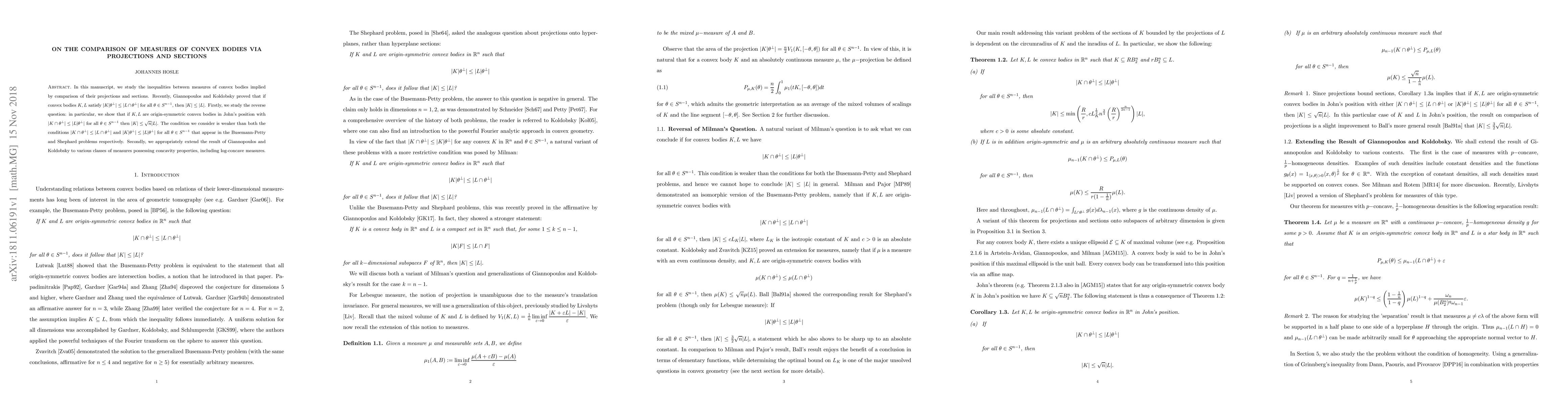 In this manuscript, we study the inequalities between measures of convex bodies implied by comparison of their projections and sections. Recently, Giannopoulos and Koldobsky proved that if convex bodies $K, L$ satisfy $|K|\theta^{\perp}| \le |L \cap \theta^{\perp}|$ for all $\theta \in S^{n-1}$, then $|K| \le |L|$. Firstly, we study the reverse question: in particular, we show that if $K, L$ are origin-symmetric convex bodies in John's position with $|K \cap \theta^{\perp}| \le |L|\theta^{\perp}|$ for all $\theta \in S^{n-1}$ then $|K| \le \sqrt{n}|L|$. The condition we consider is weaker than both the conditions $|K \cap \theta^{\perp}| \le |L \cap \theta^{\perp}|$ and $|K|\theta^{\perp}| \le |L|\theta^{\perp}|$ for all $\theta \in S^{n-1}$ that appear in the Busemann-Petty and Shephard problems respectively. Secondly, we appropriately extend the result of Giannopoulos and Koldobsky to various classes of measures possessing concavity properties, including log-concave measures.