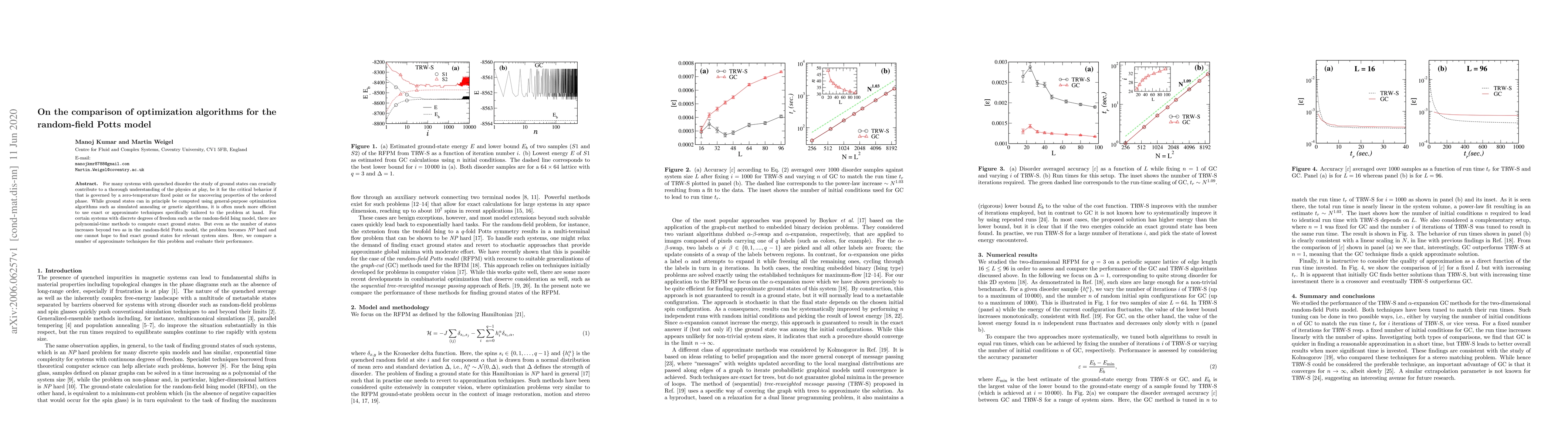 This paper compares various optimization algorithms for finding approximate ground states in the random-field Potts model, a complex NP-hard problem. The study evaluates the efficiency and effectiveness of these techniques to understand the underlying physics of disordered systems.