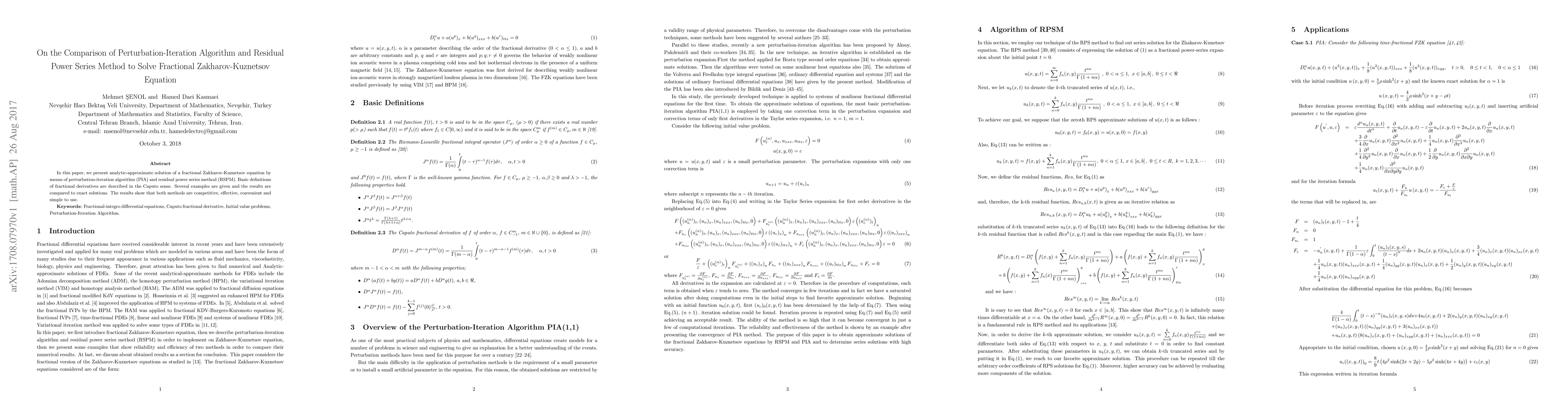 This paper compares the perturbation-iteration algorithm (PIA) and the residual power series method (RSPM) for solving the fractional Zakharov-Kuznetsov equation using Caputo derivatives. Both methods are shown to be effective, competitive, and simple, with results comparable to exact solutions.