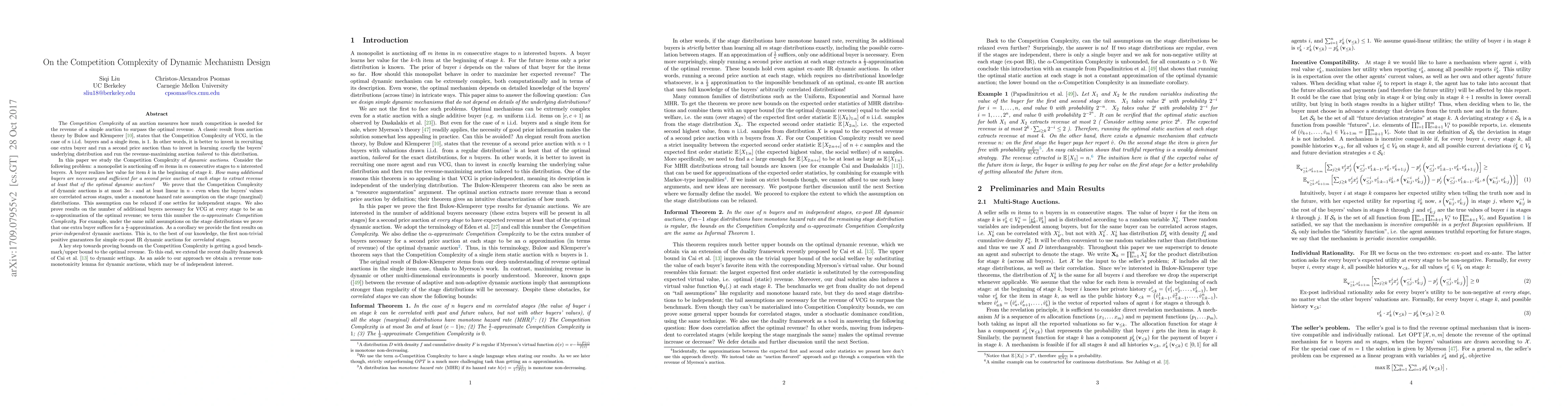This paper studies dynamic auctions, proving that competition complexity is at most 3n and at least linear in n for correlated stages, with implications for revenue maximization and competitive equilibrium.
