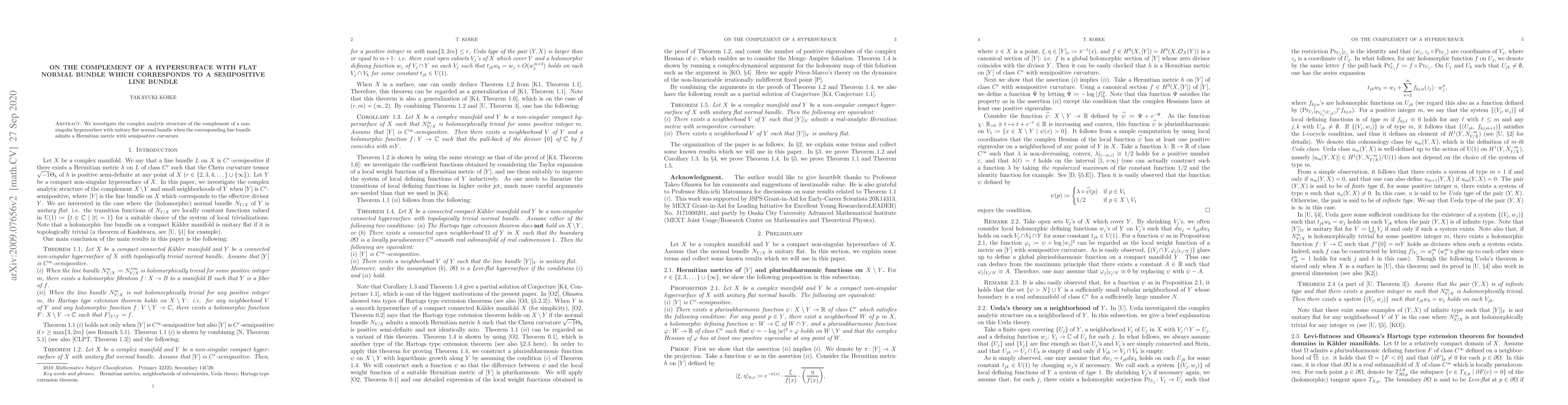 We investigate the complex analytic structure of the complement of a non-singular hypersurface with unitary flat normal bundle when the corresponding line bundle admits a Hermitian metric with semipositive curvature.